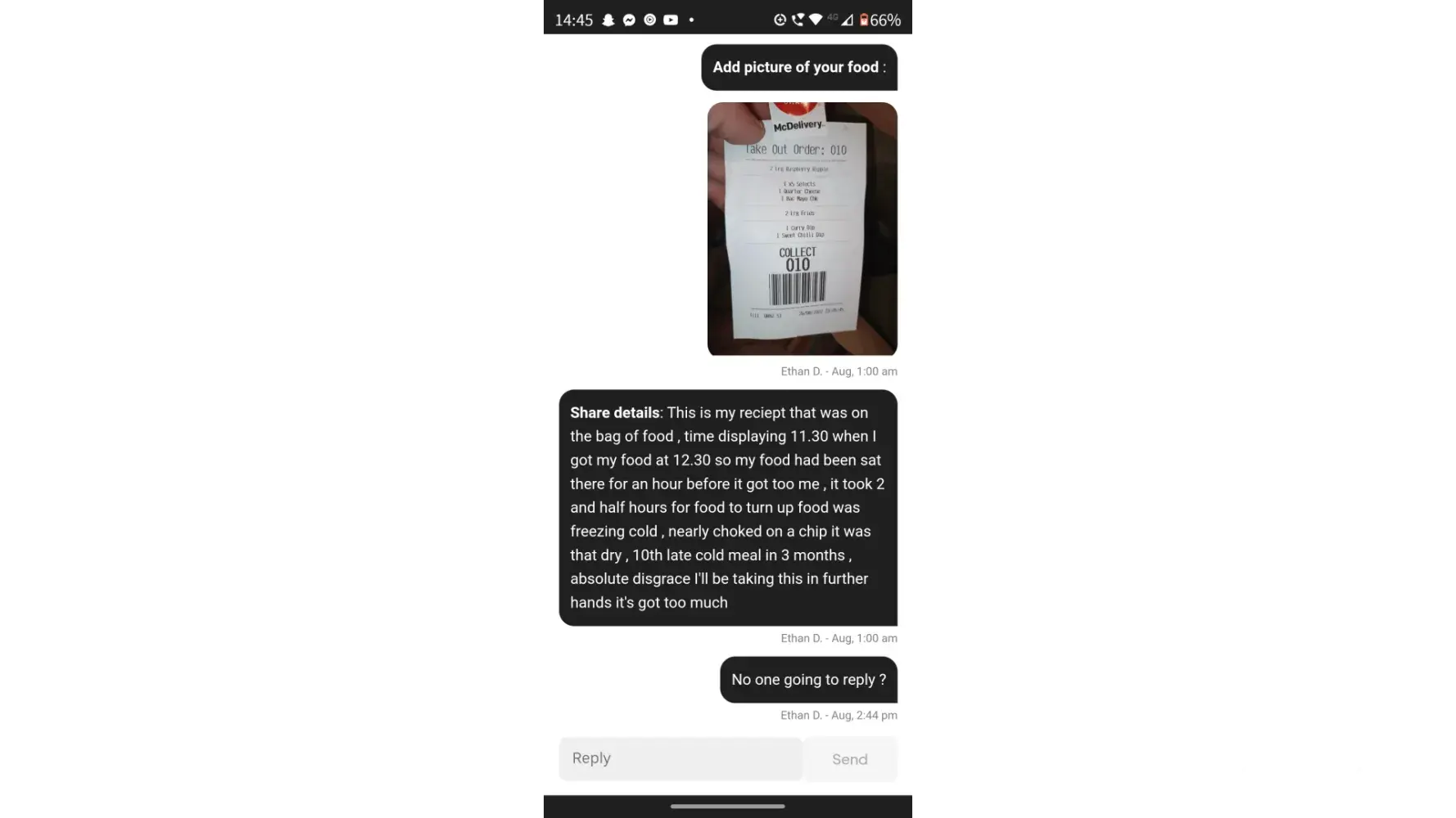 All screen shots prove my cold food! And being more than 2 hours late!!!