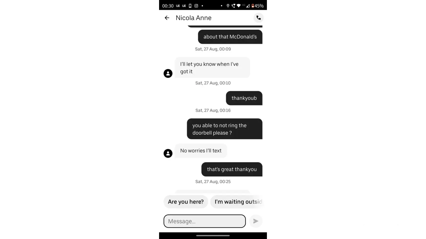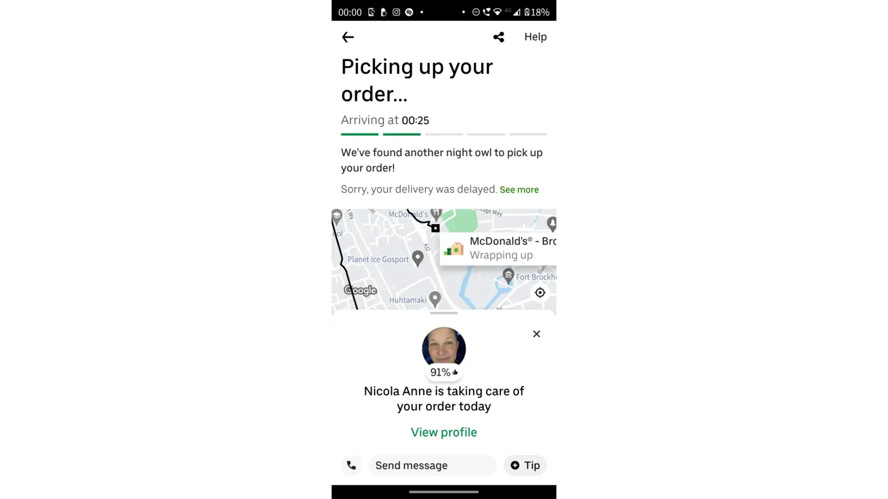 So I order McDonald's around 11pm, it tells me it'll be ready for 11.40, delivery picks it up then puts it down then delivery driver changes like twice nearly 3 times! I've got screenshots of my messages with the Uber eats delivery driver, that this restaurant is under staffed and run by idiots, and my order got thrown to back of the line freezing cold not even put under heat lamp! When my food finally arrives at 12.45 absolutely freezing and the drinks all melted no ice in them just warm milkshake, and I just asked for a refund and it's not possible! Are you joking right now! I'll be taking this too court this is like the 10th this has happened in like 3 months! I expect a refund! You gave me cold food, which I couldnt reheat cuz it's chicken! 40 quid down and no [censored]ing food! Uber eats sort it out!