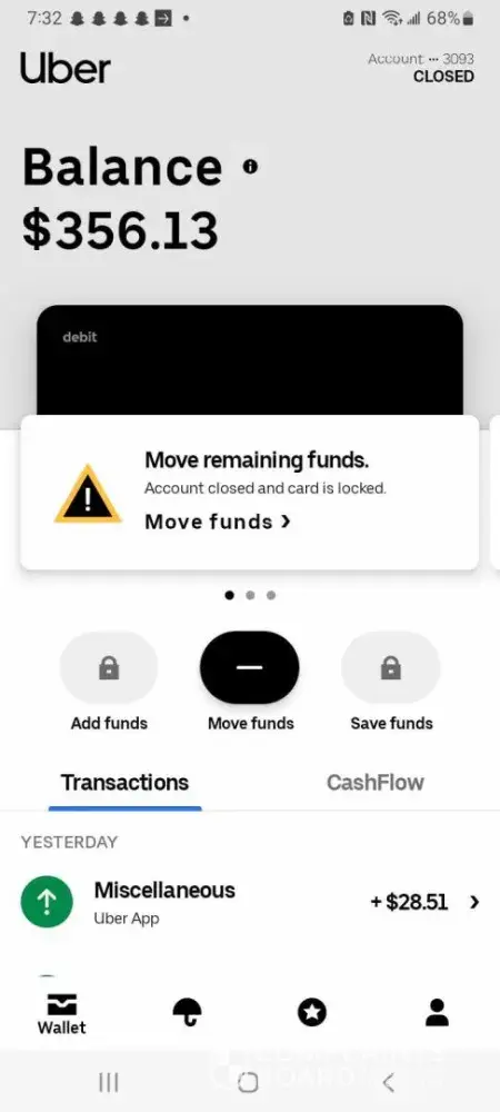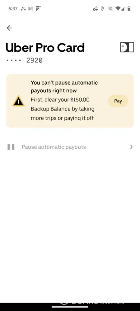 Automatically set up as the default payout method as soon as activated, no option given or feedback solicited. No way to remove it as default payout method once activated — no way to change payout method at all, in fact. I had to call support & ask them to disable automatic payouts to the card, which involved submitting a form & waiting several days for it to be processed. Now I can cash out selectively again to either debit card or bank account, but not to the pro card — remind me why not again..? Anyway… Once money is transferred to the pro card it can only be moved elsewhere by either bank transfer which takes 3-5 days & requires giving your bank credentials to a 3rd party, or by instant transfer to debit card which incurs a huge percentage-based fee. For reference, I used to be able to do an instant transfer of any amount to my debit card for fifty cents. $200? Fifty cents. $500? Fifty cents. $1000? Fifty cents. The pro card quoted me $4 and change to move $242. So immediately once the card has been activated, literally the ONLY way to access money earned through Uber without incurring their bogus new instant transfer fee or waiting for days is by driving to a no-fee ATM, withdrawing the cash, driving to the bank, and depositing said cash into bank’s ATM. Your fancy new thing should not be making my life more complicated, or costing me more money than it did before to do the same thing, Uber. Oh and last but not least: debit transactions made with the pro card seem to incur HUGE holds on available funds. I bought $40 worth of gas and an additional $150 “hold†was straight up deducted from my balance. Just gone. In the wind. For however long it took the hold to clear. (Over a day I think.) ?!?!?!@?$!?!?! For reference, that doesn’t happen at a real bank… Just don’t trust this thing people — they are pushing it way too hard & making it way too difficult to opt out or use it in any way other than the one they want you to. The red flags are not in your imagination. Don’t trust a perfect person & don’t trust an app that’s flawless.