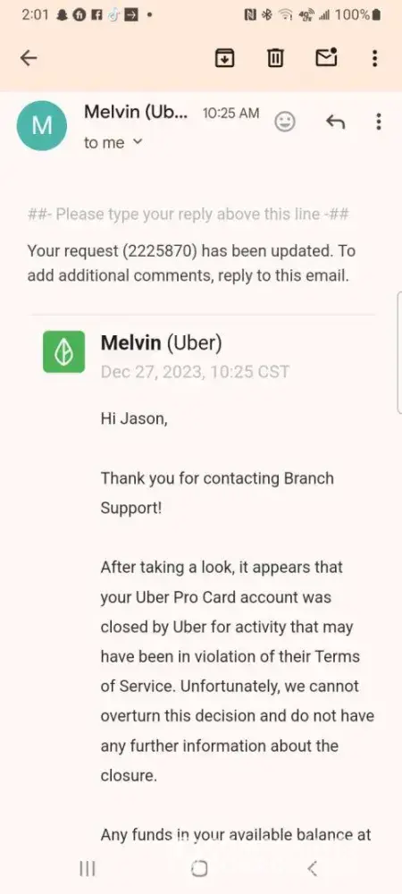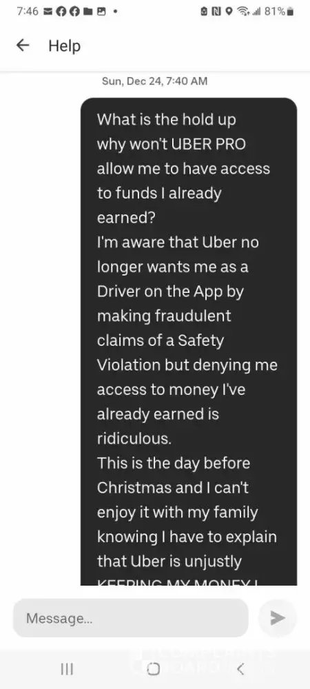 With that said, my UBER PRO / BRANCH BANK ACCOUNT WAS SUSPENDED! (Keep in mind, this was 3 days before Christmas and a week before RENT WAS DUE!) I still had $356 in my Uber Pro / Branch Bank Account that I could not transfer out because again, my account was 'suspended'.