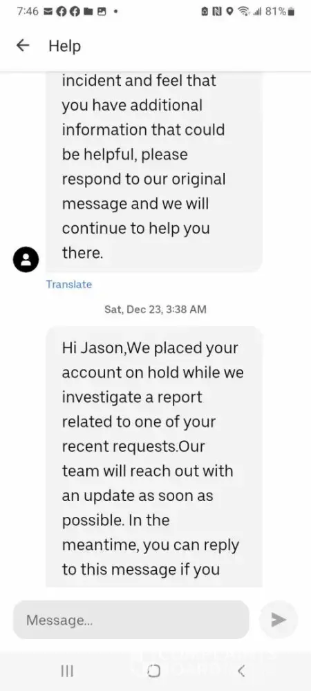 12/22/2023 UBER put my account on 'HOLD' (they did NOT suspend my account) for what they said,