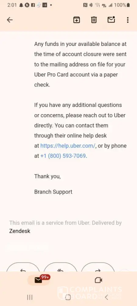 I'm NOW Aware, Uber Pro / Branch Bank has NO INTENTIONS of sending me a Paper Check of my Hard-earned money. Keep in mind, Uber Pro / Branch Bank, Trust Bank is a Online Banking Service, meaning there is no Institute for me to Enter and speak with someone face to face. I have to wait patiently via text messages, emails and phone calls only to be told, 'Ohhh I'm so Sorry! Wait 15 more business days and It shall Arrive in your Mail!"