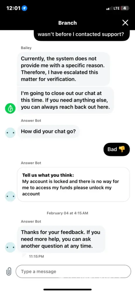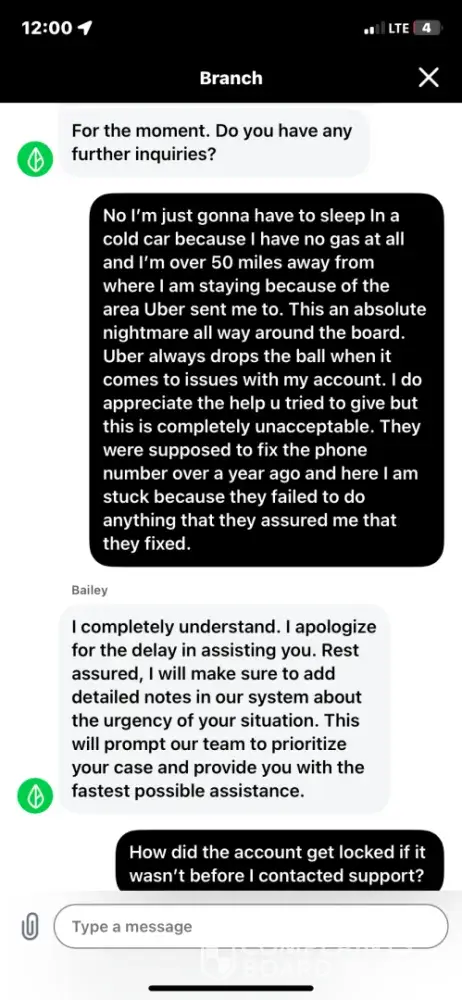 I hadn’t been driving due to personal reasons so I was off the Uber platform for a while. Uber Pro Locked my account and the money I made when I came back I have no access to. I reached out to the support team 5 days in a row and all they did was submit tickets to a department with “no phoneâ€. The guy I spoke to this morning was very condescending like it brought him pleasure to tell me there was nothing he could do. I can’t wait to disconnect my Uber account from BRANCH. The worst!
