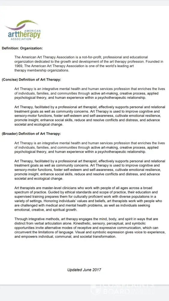 I am an art therapist and what they are selling is not art therapy. You need a masters degree to be an art therapist and you need to be an art therapist to say you are providing art therapy. This is shown by the attached screenshot of the definition of art therapy by the american art therapy association.