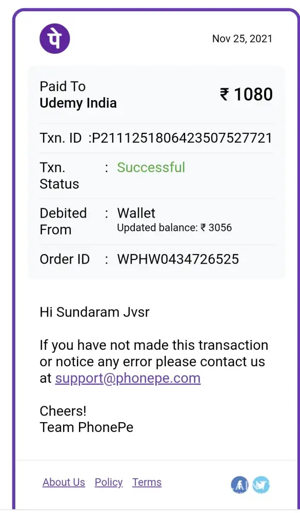 Udemy.com is real scam organization. Here is my experience. I have purchased 3 course's from Udemy and paid 1080 INR from my phone wallet. I have not received access to my purchased courses. When I contact Udemy customer support, the said they have not received money but I can see that money was deducted from my phone wallet and I have transaction id. Funny thing is, During my discussion with Udemy customer care representative before I provide them transaction id, they said even though I have transaction id they can't help in providing access to my purchased courses. After 48 hours, they mentioned that they have not received money and hence they cannot provide access to my purchased courses. Even though you have a transaction id which clearly chows that payment was done to Udemy india as shown below. I request all who wants to purchase courses from Udemy, just think twice and it is up to you. I AM SURE THIS IS A BIG SCAM.