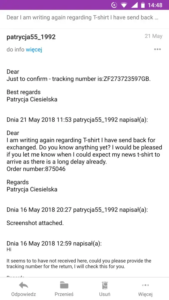 I have ordered 3 personalised t-shirts on website. When my parcel arrived I realized there was a spelling mistake on one of the t-shirts. Been in contact with [protected]@uksoccershop.com and they asked me to send it back for exchanged. There is over two months since I send my t-shirt back and I still do not have it. Been in contact with them again but they ignore my emails or replays seing that person how is dealing with my return is on leave but they will be in contact with me. Of course noone gets back to me. In case someone is on leave I do believe there should be someone to replace that person.