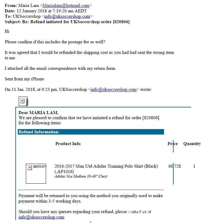 Then I realised they had sent the wrong shirt. I emailed them and a gentleman named Biju advised that I could return the item and they would process the refund, including refunding the postage fee as it was their fault for sending me the wrong item in the first place.