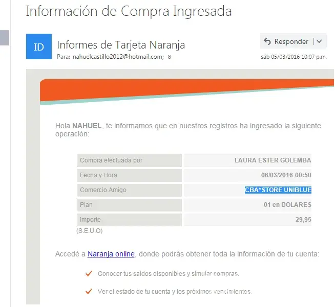 se débito de mi tarjeta de crédito Naranja-Visa u$s 29.95 sin mi autorización, yo no utilice este servicio y pido que se deje de baja sino iniciare acciones legales.