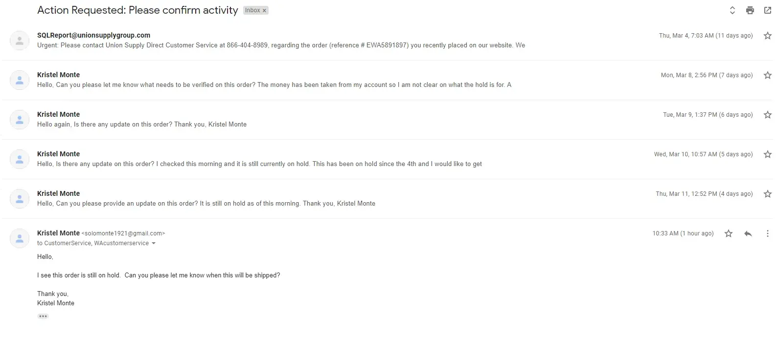 My son is in a state prison in CA. I ordered a package for him (Order # ECA5827178) from Union Supply Direct on 1/28/21. The next day I checked the status on the package and the message said it was on hold and that I should call customer service. Since 2/1/21, I have emailed both their customer service addresses 6 times and have received no response. I called both their customer service numbers at least 20 times this month, and every time I get put on hold; after over an hour waiting I hang up. I have tried the chat line and have gotten no response. Today I called company headquarters in both CA and TX and was put on the same hold line, and again I hung up after an hour. There is an issue of time here. If my son does not receive this package before 3/31/21, he will have been denied his state-authorized right to receive a package in the first quarter.