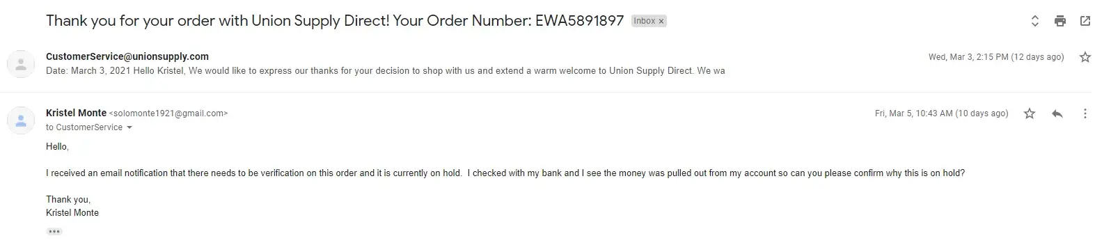 I placed an order through Union Supply at the end of January. My order was canceled and was issued a refund back to my account. Union Supply charged my account again for an order that was canceled/voided and another order was never placed. To actually speak to a live person is Impossible and to get a response through email is a joke!