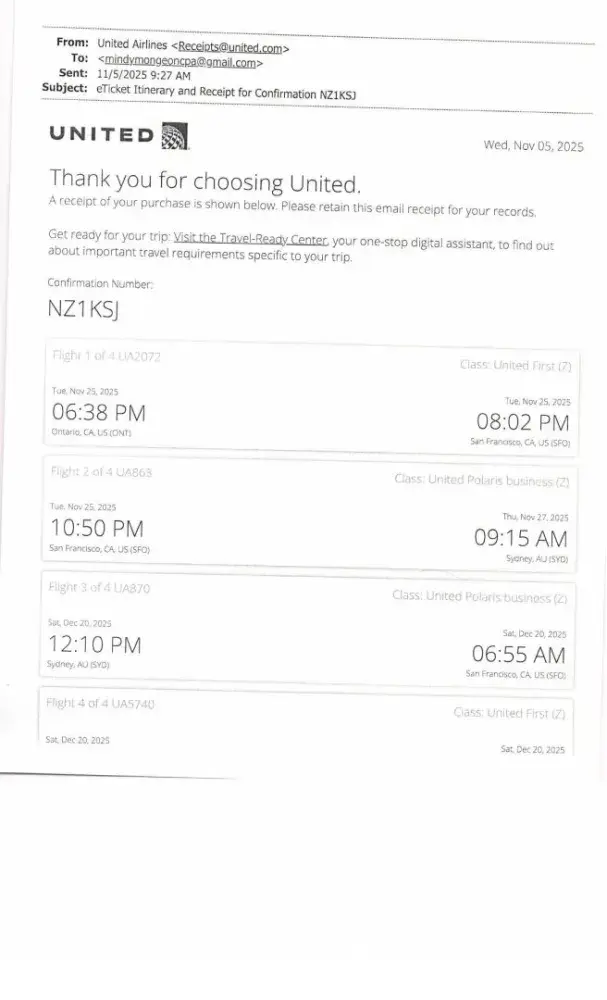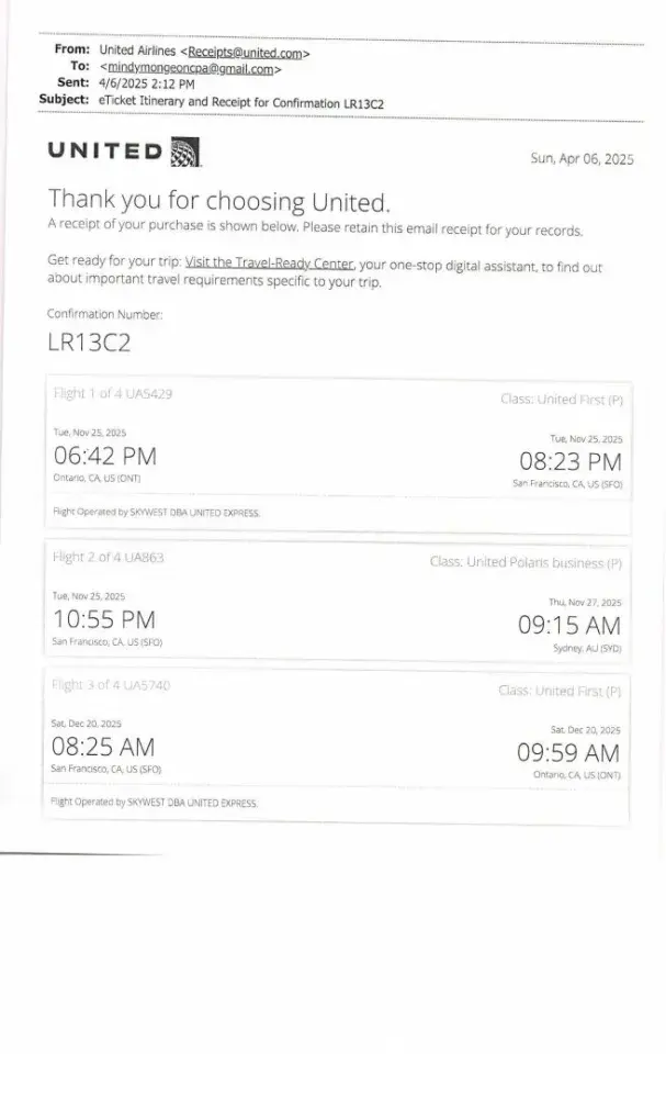 RE: eTickets Itinerary - Receipt for Confirmation F33CT3 - Luis Ariel GEVARA AND Ivonne GEVARA --- The UNITED AIRLINES portion of the Itinerary being reported is as follows: Flight 1 of 6 UA2366 Thu, Aug 31, 2023 -- Houston, TX, US (IAH) to San Francisco, CA, US (SFO) --- Flight 2 of 6 UA1 Thu, Aug 31, 2023 - Sat, Sep 02, 2023 San Francisco, CA, US (SFO...