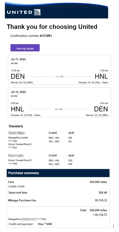 On 6.17.22, I clicked "purchase reservation" in accordance with the contract and ordered my tickets for 660,000 miles. I paid $1710.33 via credit card for the gap in miles between my account and the 660K.