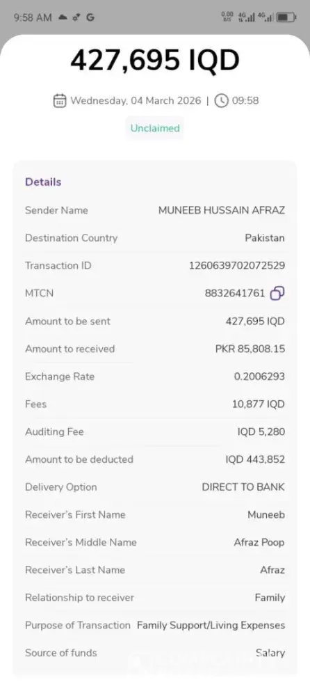 Rs.85,808 send from iraq on 4 march in pakistan