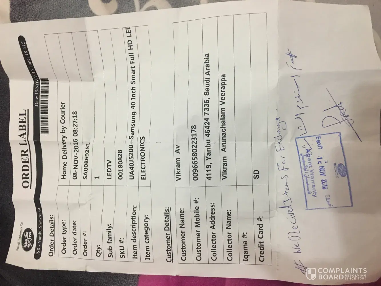 My mobile number is [protected] it's a Samsung led smart 40"tv I bought it online on 8th of November and I received it on 15th of November then I saw it was a damaged item and I called extra customer service they said to replace it to nearest branch on the same day I went to the yanbu branch I returned my tv they said stock is not there and took my tv and said I will get a call from ecommrce department I am waiting till today 6th dec, till now there is not even a missed call from the store. Please be noted that my order is just 1000 riyals but I spended on calling and visiting nearest branch for more than 250 riyals don't know who is going to pay.