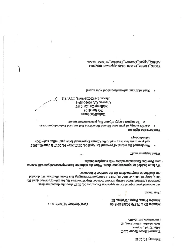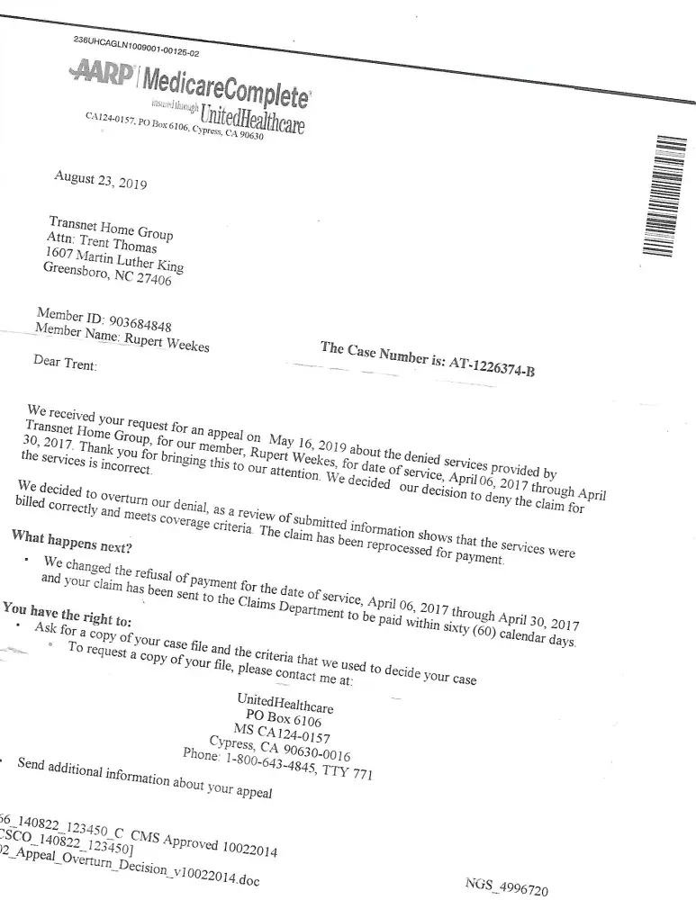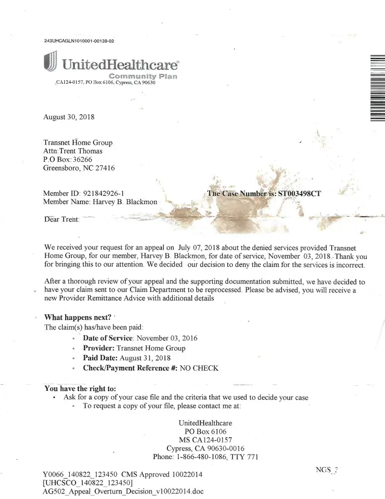 It has been over three years since services were provided and I am still awaiting payment even after several appeals overturning the original denial and promising payment within 60 days its been over 6 months since receiving these letters and still no payment. When I call I get consistently transferred over and over. I then get sent to another appeals process even though one was successfully completed on the exact same claims and again letters promising to pay within 60 days with no payment. I have all the letters from uhc with corresponding case numbers. My company name is Transnet Home Group business lic # [protected]. My name is Trent Thomas and I can be reached at [protected]