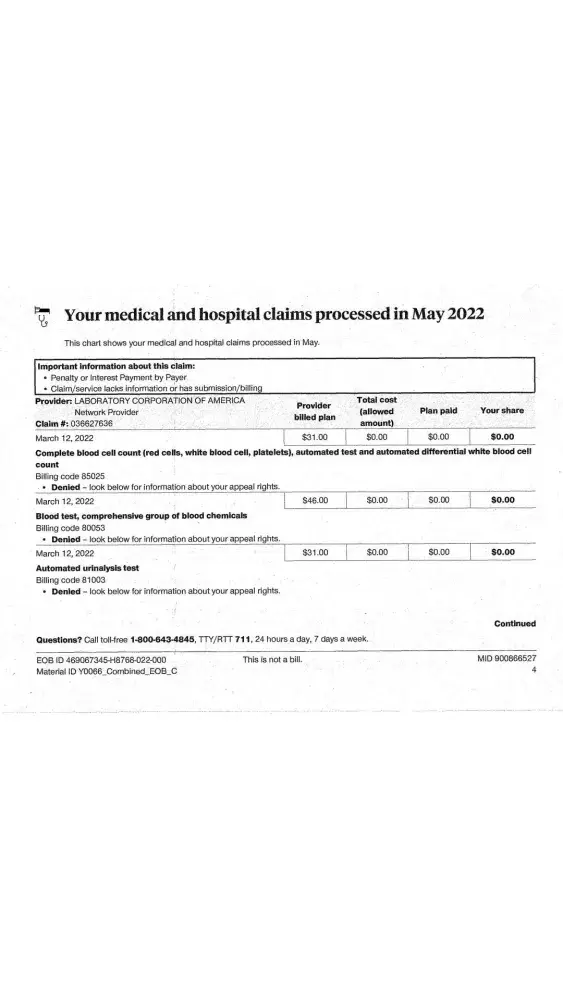 Claim # [protected] for routine blood work for yearly checkup was denied.