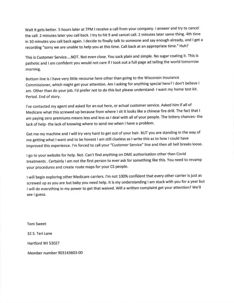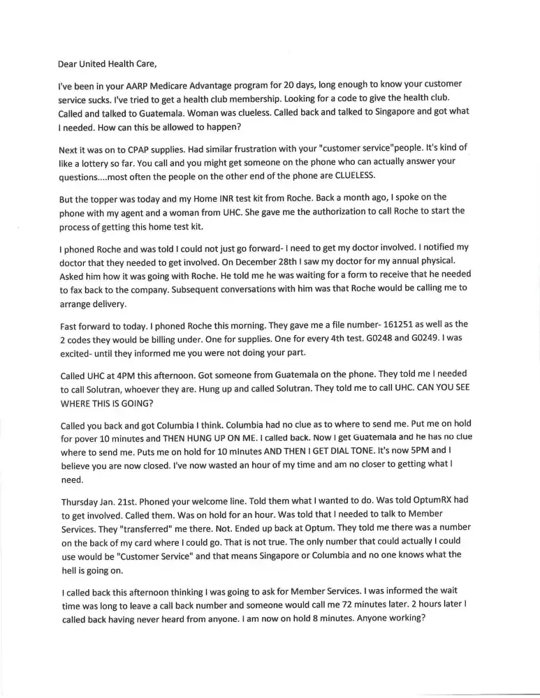 I already sent a letter to regarding my denial by the medical group to: dirk mcmahon, anne docimo, brian thompson, ed lagerstrom, and alexander perkinson on october 14 on the denial of a doctor who was in my group, but they don't seem any of their members are important. I have been struggling for 4 years with a disease that no western medical doctor in this country knows how to treat properly, so I am just trying to find a doctor who even cares over the usual, take this or that pill! This, by the way, is my "6th" grievance on this insurance company that places profits before people. It is obvious to me that their huge profits ($183.5 billion) are attributable to their "kind" of sick care their members have to either "enjoy" or "endure". It is totally unconscionable that these insurance companies continue on a road of silent abuse, yet their commercials and ads paint a different picture, luring people into their demise.