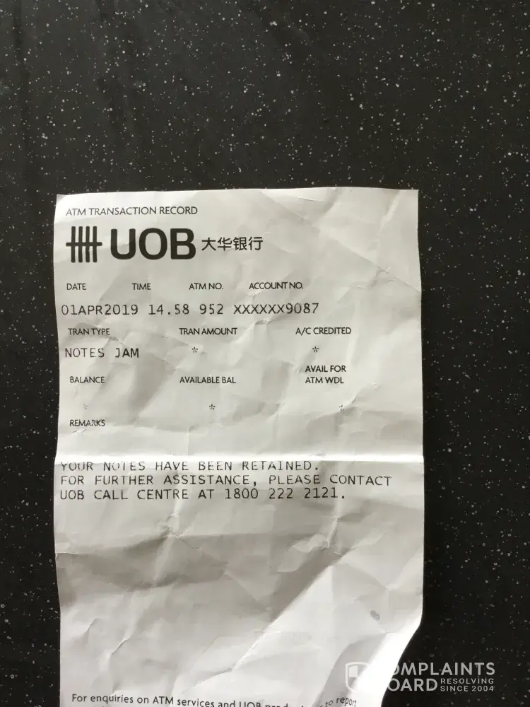 I have waited 7 days and never recieved my cash back . It happened at atm 952 on 1st April 2019. My cash was 50$ notes 85 pcs .i felt so disappointed it took so long and made Me worry and it caused my cash flow problem and cannot transfer back home ! I made report immediately and kept getting the same answer like still investigating and never bank in yet . I even visited to UOb branch and made report. I am hopping to get my money back immediately. Pls action ASAP