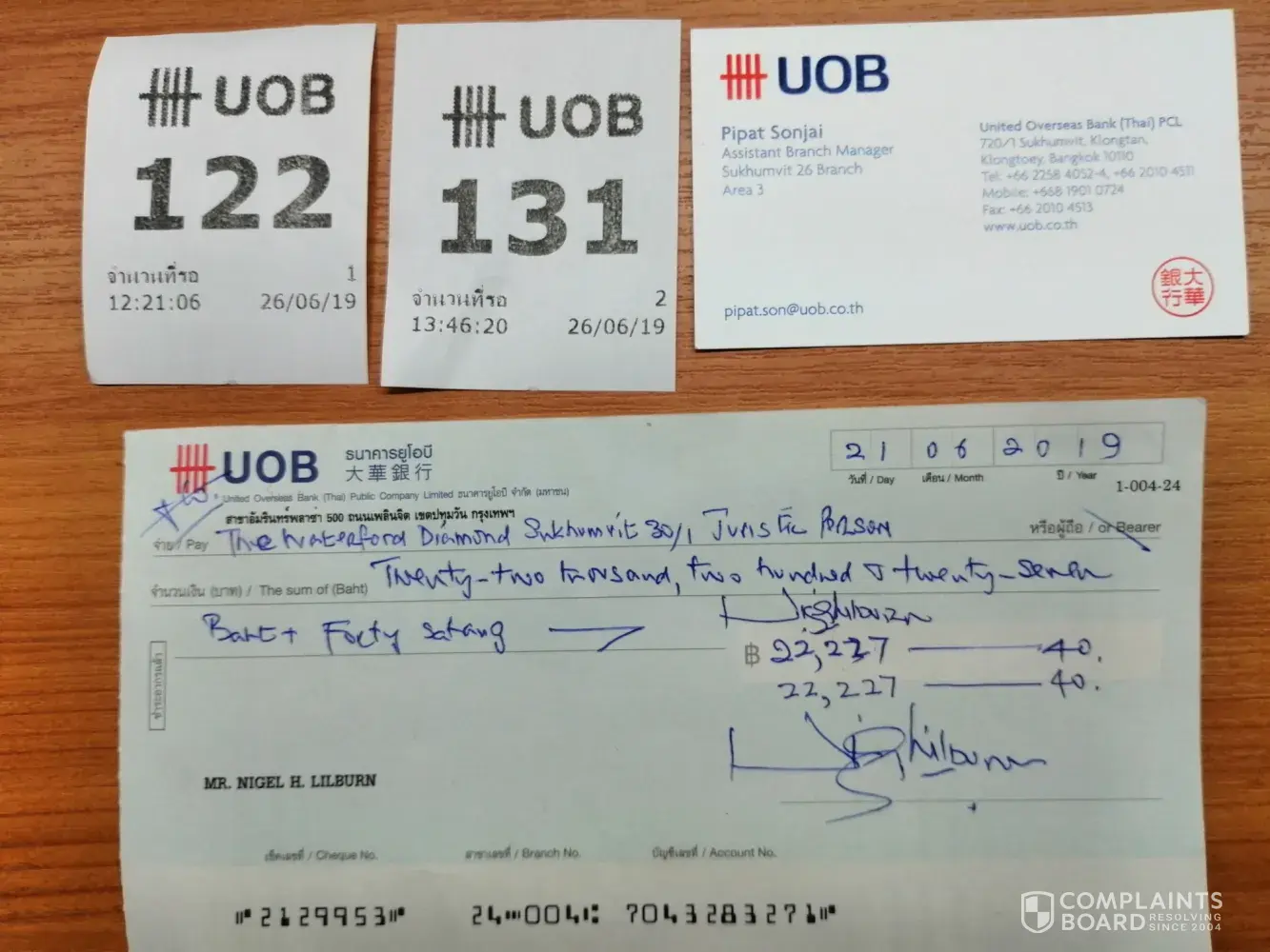 1. Refusal to cash a cheque written by myself to be drawn from my account at the branch to pay Bt22, 227.40 to The Waterford Diamond Sukhumvit 30/1 Juristic Person (condo) which has its branch at Siam Commercial Bank, Emquartier (Phrom Pong)