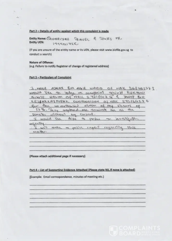 I have been the sole signatory of Qodariyah Travel & Tours Pte Ltd since 1999 and also the main shareholder. However, after Yusof Kezakkaypurak Kunhimoidin (S7236608E) voluntarily decided to be part of this 19 year old travel agent but I still remained as the sole signatory. To my disbelief, I was speechless when I discovered he replaced me discreetly my part ownership with Rukmini Halim (S7210217G) and I received sms from your bank to state that my token [protected] had been unassigned.
