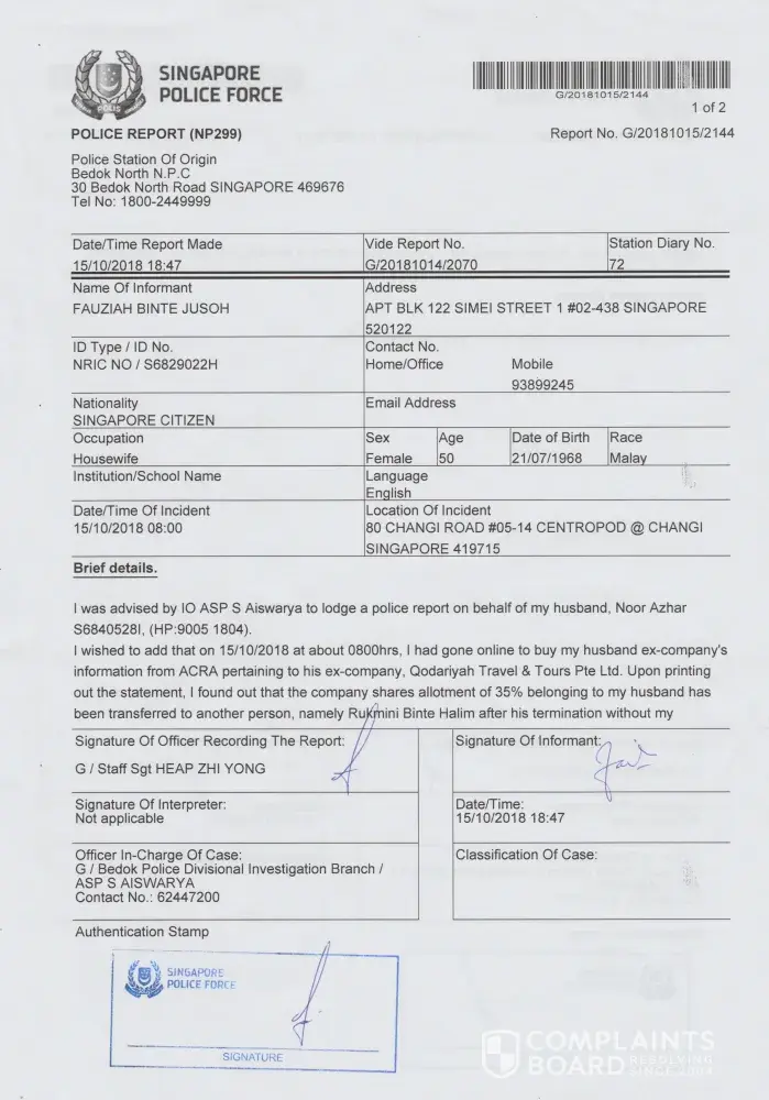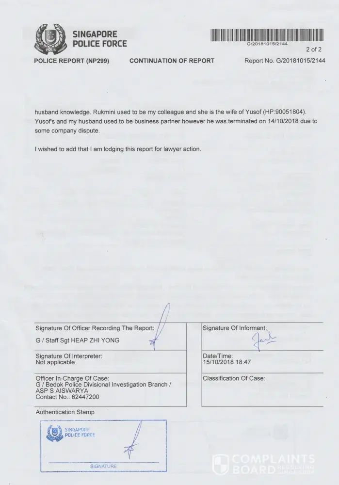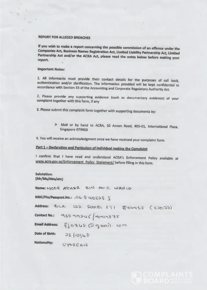 Last Monday (15 October 18), I have lodged formal complaints to ACRA and Police (please refer to the attachments). They are investigating the complaint.