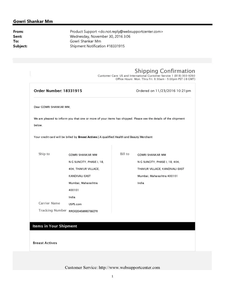 Hi, I have ordered breast active product from breastactive official website and i got mail confirmation from websupportcenter.com on 24-11-2016 and got shipping details confirmation on 30-11-2016. details as below