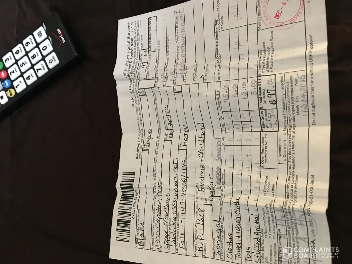 I sent a package from the Upper Marlboro, MD office to Dakar, Senegal. The package was sent on December 4, 2015. It was returned to me in January 2017. The only thing that the note on the box says it was missing the content description. The receipt that I have shows where I filled out the contents in the box. It cost me $77.50 to send this package. I feel that the Post Office should resend the package at their cost. I filled out the Customs Declaration and Dispatch Note - CP 72.