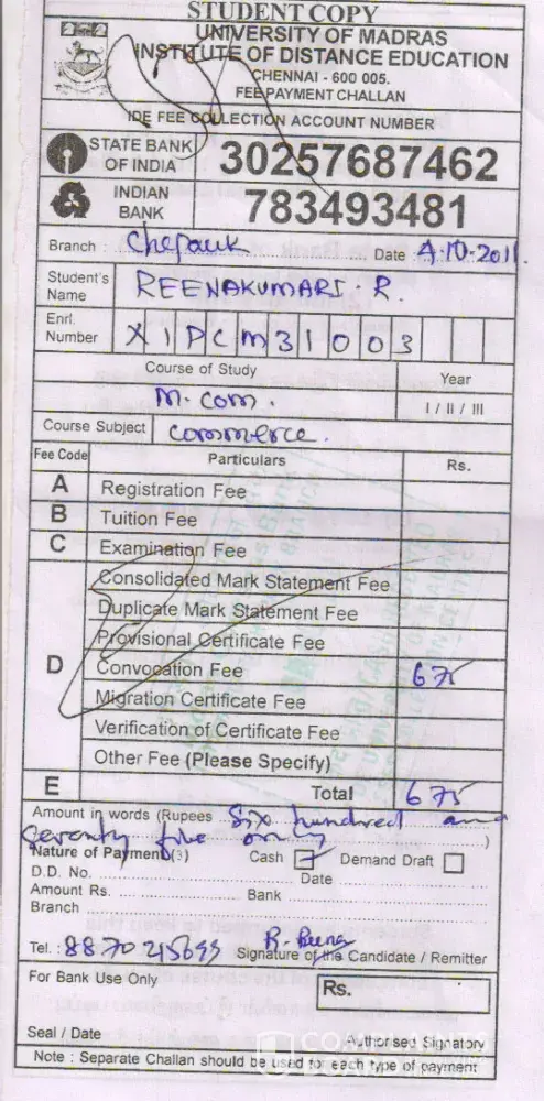 My wife reenakumari r completed mcom in dec 2008 through university of madras open university. I paid fees of rs 675 (I attached scanned bank channel) for issuing convocation certificate on 04.10.2011 and approached personally no response received. Enrollment number xipc31003.