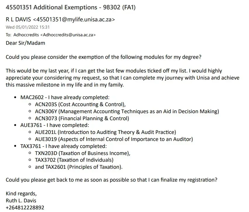 MyUnisa says to email [protected]@unisa.ac.za if there are any queries regarding exemption, and therefore on 5th January 2022, I sent an email with an application for exemption to that email address (see attached screenshot).
