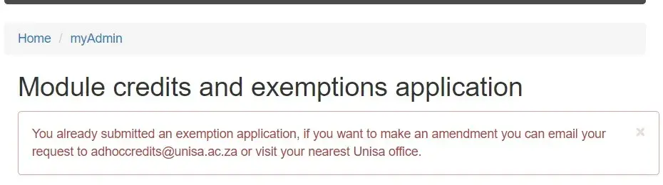 I can't submit any applications for exemption on myUnisa, because it says that I have already submitted an application for exemption (see attached screenshot). The history: In January 2021, I submitted an exemption for some modules, which I only got a response to in August 2021