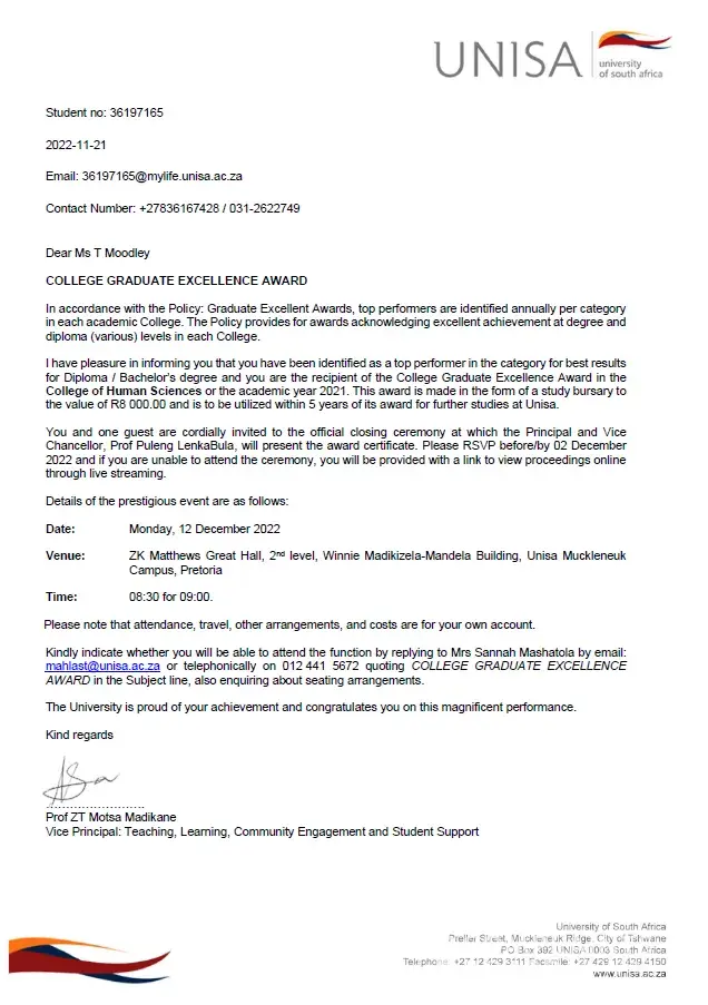 I am truly disappointed with Unisa in this regard. I have been a student at the University for over 10 years and have obtained 2 degrees with you. To be awarded a bursary and then be simply ignored is utterly disappointing. I have contacted Unisa numerous times via email, telephonically and via social media DMs. Not once have I received a response, except for the automated email responses.