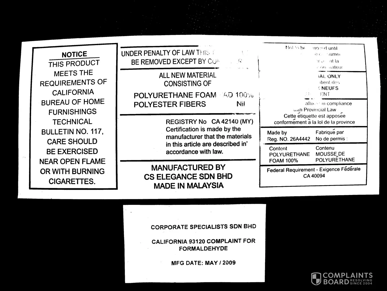 In addition to the mold that is quite dangerous, the furniture reeks of formaldehyde. I had wondered what the odor was in the apartment until I found the label under from beneath the table. The kitchen table, stools, night stand, and dresser all have labels stating that the furniture was rejected in California for formaldehyde. These are on the back of the dresser and night stand and underneath the table and stools. The last apartment I had there still reeked of formaldehyde when I left in July of 2012 even though I kept the window open in all mild weather to dissipate the scent. Formaldehyde is also a dangerous substance.