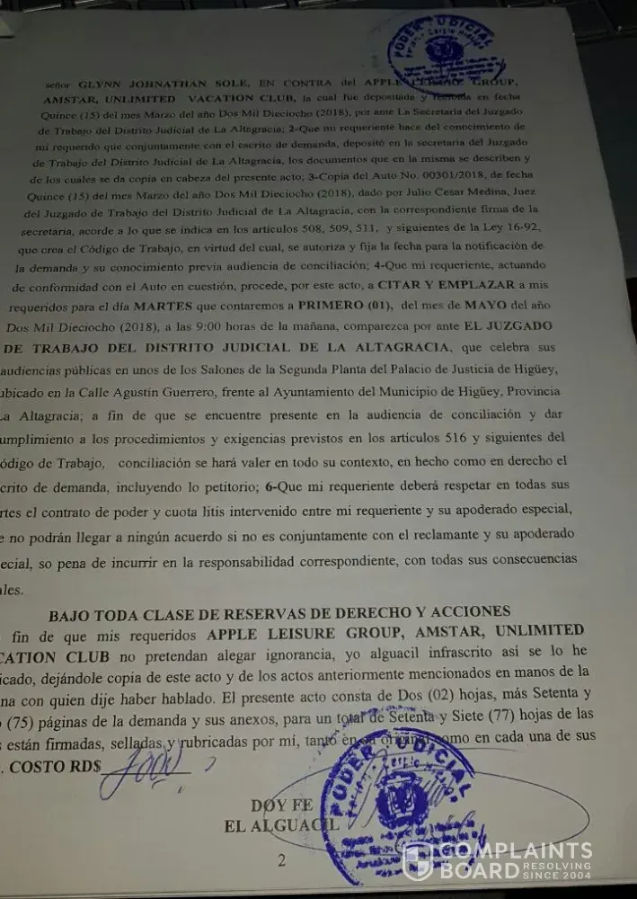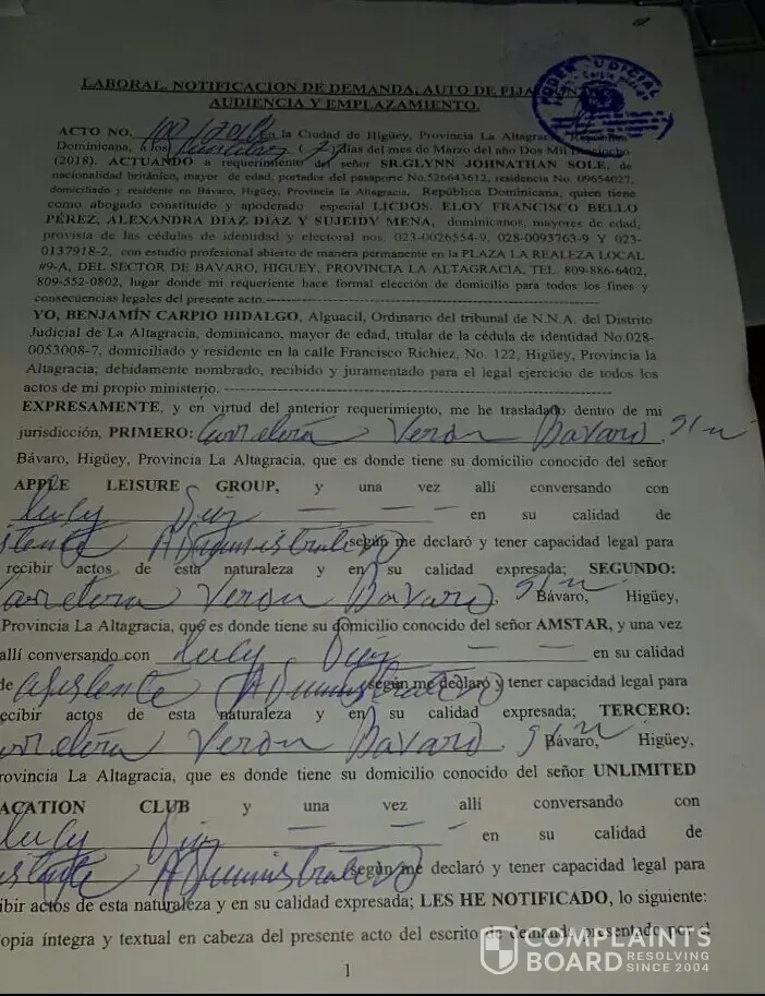 I then went and spoke with the head of human resources for the Dominican Republic who, in my presence, called the regional director to arrange a meeting to try and resolve this issue, a meeting was promised with details to be confirmed later that same day. Two days later, hearing nothing from them I engaged a lawyer to act on my behalf. The very next day I was asked to meet the regional director who claimed that morning was the first he'd heard about the issue which was another lie. Several days later I was summoned to the paymasters office where it was demanded I sign papers in Spanish which I didn't understand, even if I had understood the papers my lawyer had told me not to sign anything until he had looked it over.
