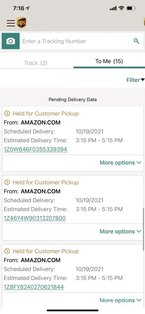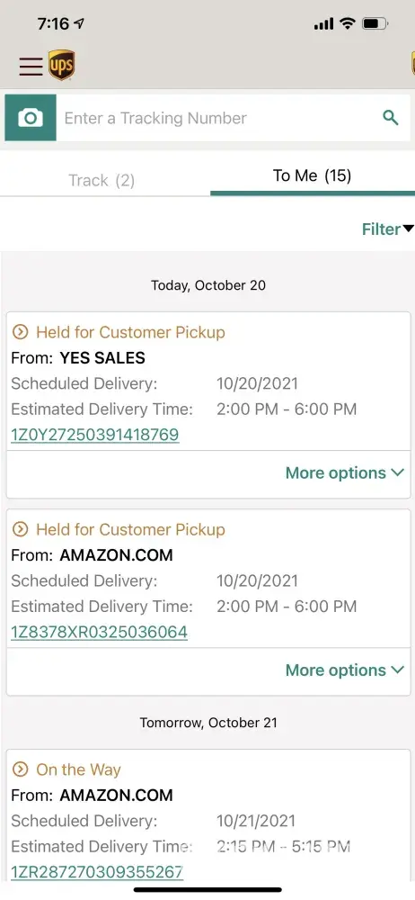 January 7, 2021. I was able to catch the supervisor and after work she brought my package to my house on her off time that night. The tracking number is 1Z8162011250616559.