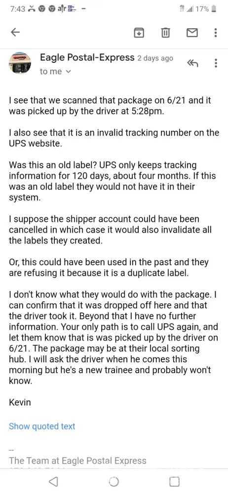 Not happy with UPS at the moment. I was returning an item to Amazon, and they paid for the return. All I had to do was be available when the driver arrived. I am home all day long. The driver placed the shipping label on the ground outside my door and never knocked or rang the doorbell. My roommate has a couple of dogs and they would have gone nuts. So my roommate happened to be pulling into the driveway when he was putting the label on the ground. She came in the door and asked me about it. I was in the kitchen, and the box was waiting by the door. She took the box out to him and got a receipt. The issue is, I would have had to schedule another pickup, and the item being shipped back is a portable ac unit. They need to get the old one in order to refund my money. I have the hottest room in the house, so that is why I bought an ac unit. Meanwhile, I am suffering with the temps so high. I am disgusted by his disrespect and unprofessional act of putting the label on the ground! He should have knocked or rang the doorbell!