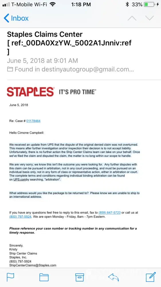 I shipped my tv through a staples agent. No one provided me the option for right shipping products. I sent in a heavy duty tv box. Ups damages my tv and does not return my $110 fee or honor the $100. The claims dept denied. Twice. I'm doing this one last time for Proof to the Govt agency's that govern you that I tried to resolve. I do not have the tv it's damaged in California I now live in florida please return my money and $100 insurance to buy a new tv. I'm going to blog better business bureau and contact consumer protection etc. Next will be small claims for my damages and money this cost me. Please end this! I have you all over google and help! I'm not stopping until I get my money.