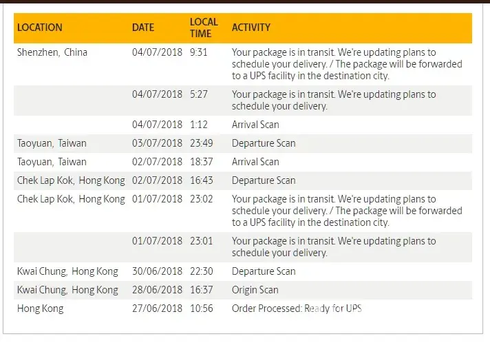 Hi, as per the system, shipment of 10 cartons were handed to UPS HK (from Shenzhen) on 27 June 2018. The cargo was in HK for a few days before they were exported on 2 Jul. What was more ridiculous is that the cargo was shipped to Taiwan (destination country) and back to China on 3 July and still in there on 4 July. What's the point of having to pay for expedited delivery when it was taking more than a week and still not delivered.