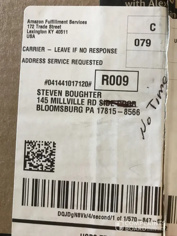 My address shows the street number and the notation "side door". I do not use the front door except on rare occasions. My driveway leads to my side door. Today I got a package - to the front door- and "side door" on the label was scratched out and written in by hand was "no time". ?!