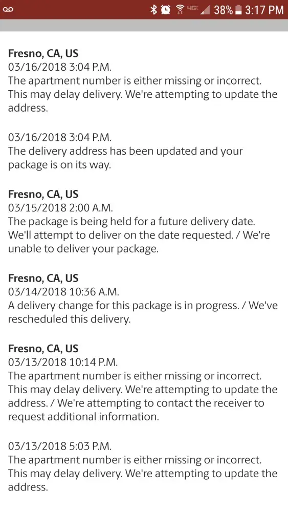 My package was supposed to be delivered on the 13th of March 2018 and was sent back to the facility because they stated it needed an apartment number. I confirmed to them no apartment number was needed. They said it would delivered on the 15th. Still no package. I called again, they said the same thing, needs an apartment number, after i had just called to tell them it doesn't need one because i do not have one. They connected me to the area supervisor in Fresno, CA. She said she would put it on the truck for delivery for the 16th. AGAIN, no package. She never updated my information to deliver to my address. I called again, today, the 16th, and they had the same lady call me today, the 16th. She told me it wasn't deliver because I didn't confirm it to be delivered or picked up. I specifically told her I was not picking it up and that the shipping to my address was already paid and it s their job to deliver. I told her she was rude and ask why was she messing with the delivery of my package and she hung up on me.