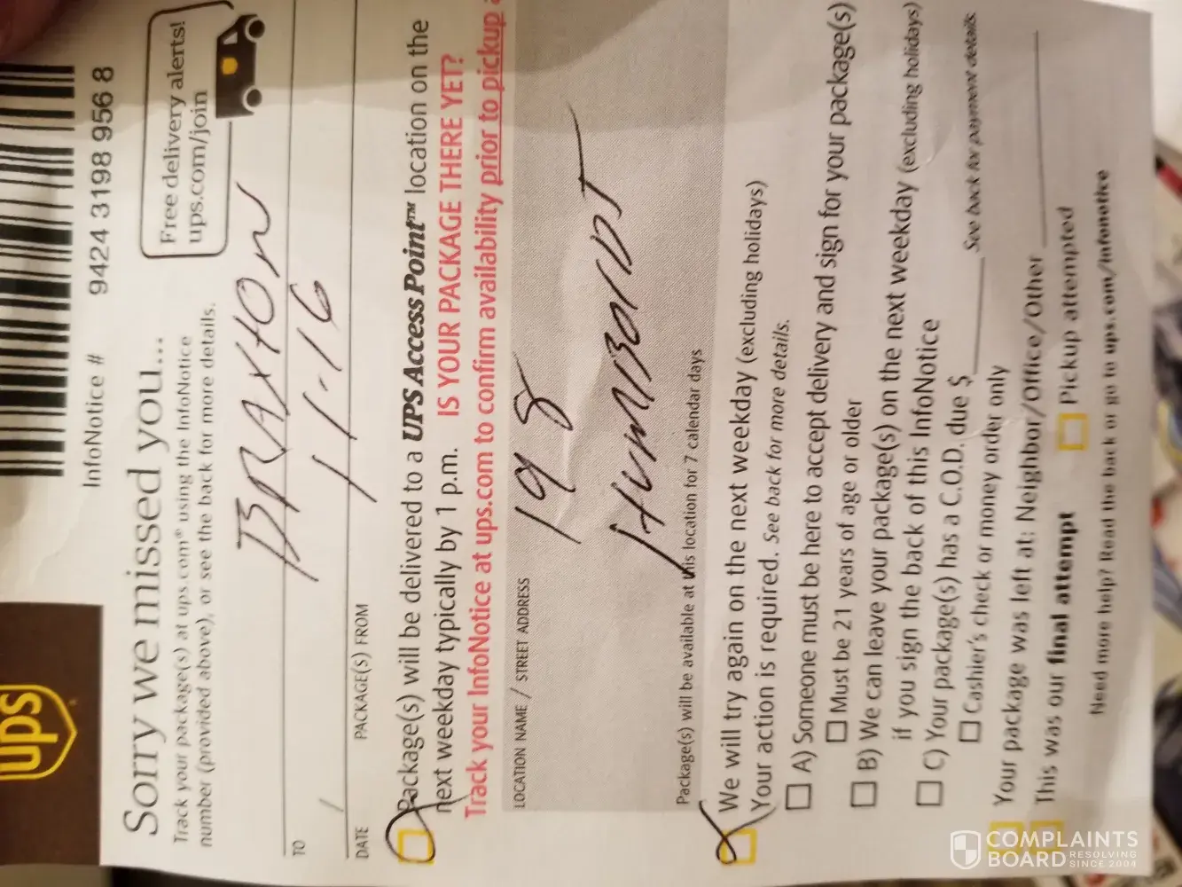 I complained thru customer support UPS on phone at 5:30 PM.