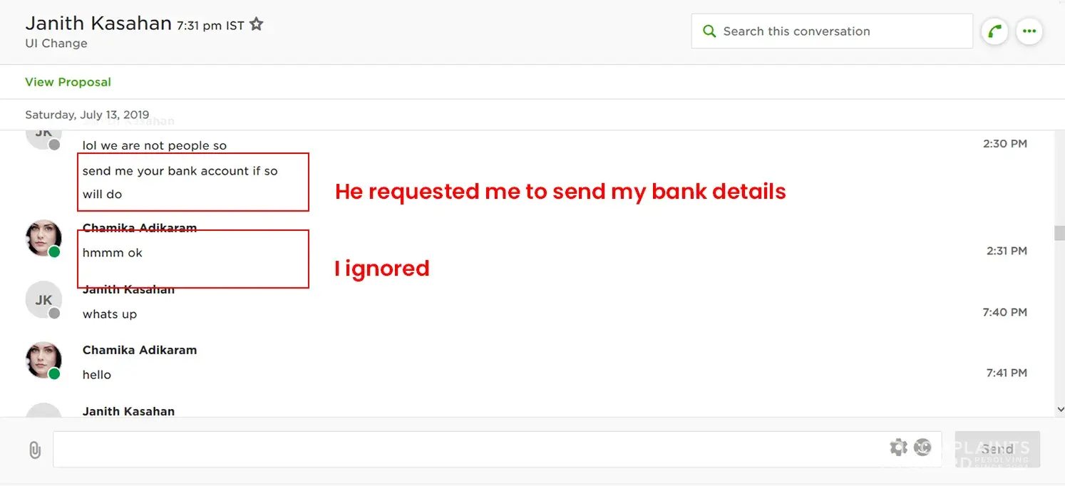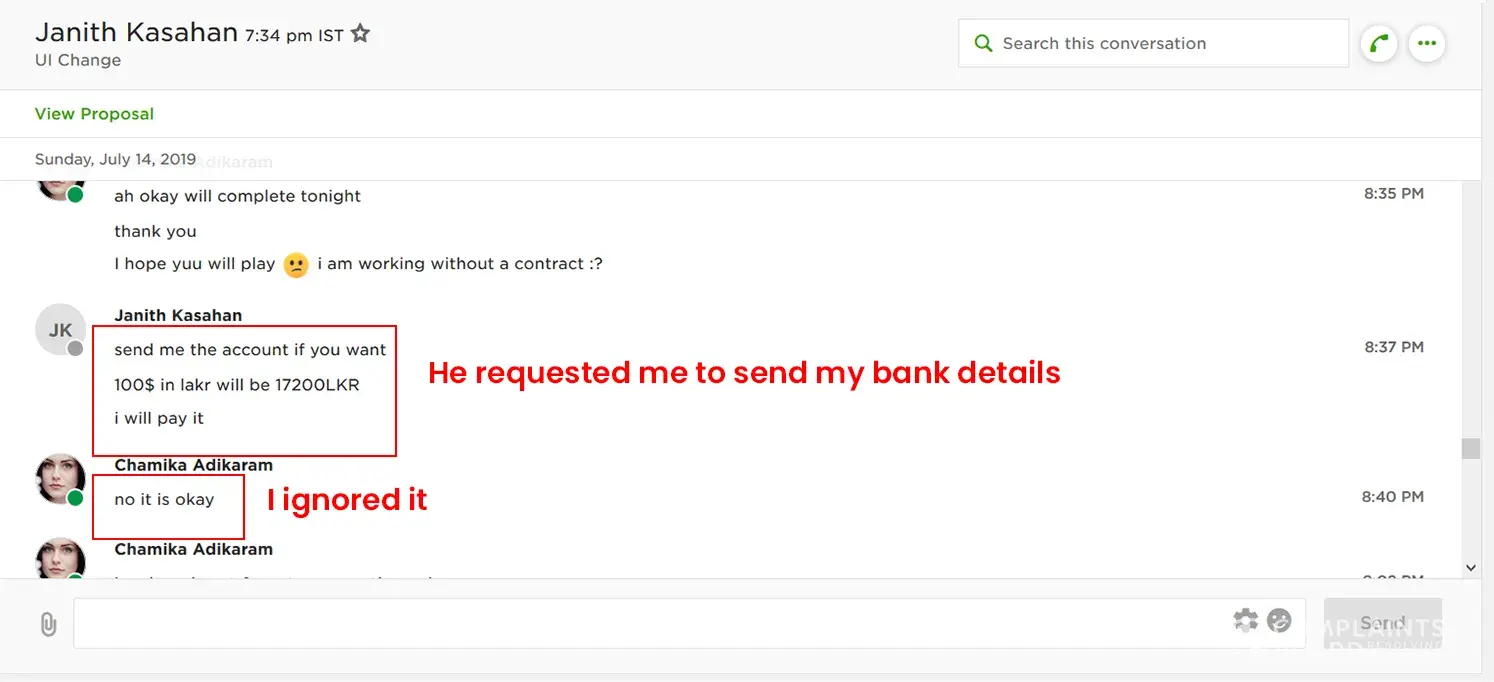 I have created this account and I approved this account after trying several times. Then I have worked with so many clients successfully and my job succeed value was 94%. But because one client I have confused. He just wanted me to contact outside of Upwork. I ignore SEVERAL TIMES and I requested him to send me an offer several times but he didn't do it and he asked me to send my bank details. I ignored it more than twice and finally he force me to send and then I sent. That was the only option was.