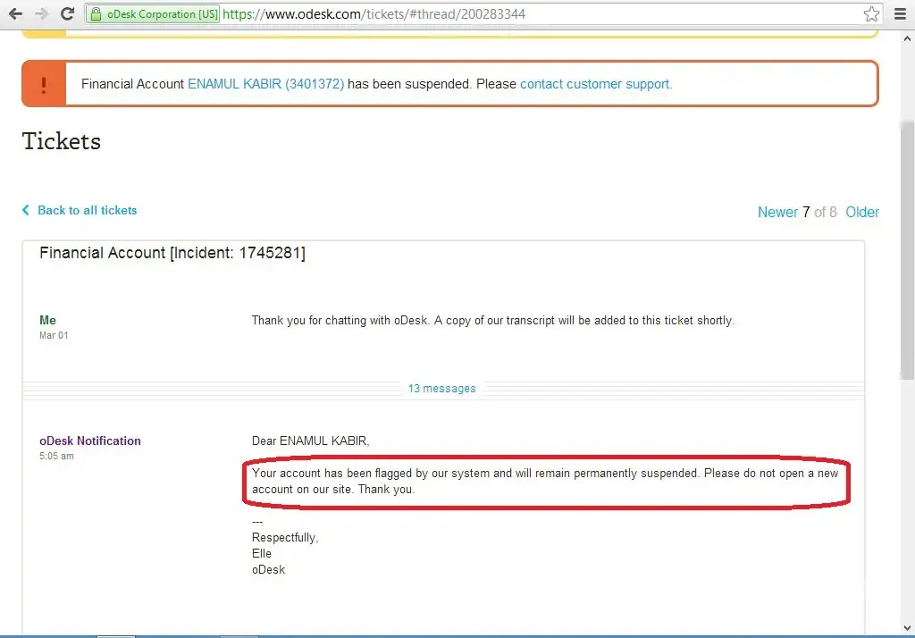 Odesk sucks.. they suspend your financial account with no grounds at all. And their customer service can not even answer your questions... much more when you ask them on how to resolve such issues. They do not even know where to contact those people who gave the ticket. I do not know what these customer services for. Odesk has no right over our hard earned money. They are only a mediator and they took 10% of what we get from working hard. They can not get what is rightfully ours..Because it is never theirs...