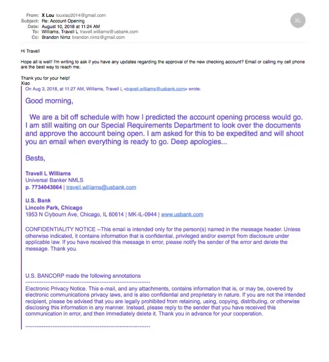 By the end of July, i worked with the banker Travell Williams at Lincoln park branch in Chicago to open a non-profit business checking account. After i provided documents, banker told method account can't be open for agent, but can be opened for the president of the organization, so i brought the president in. Travell assured me that he received everything he needed. Once the back office approves it, the account should be up and running. However, after 3 days, which is early august, i still didn't hear back from him.Starting from august 9th to august 27th, i called 5 times, left two voice messages, left messages to the bank teller, emailed the banker multiple times but received no response at all. On august 28th, the banker emailed me of the decision that the bank can't open the bank account due to the same issue- account can't be opened for agent. I emailed back asking why it is still an issue since i already brought the president of the organization to the bank in person but again, the email was ignored.