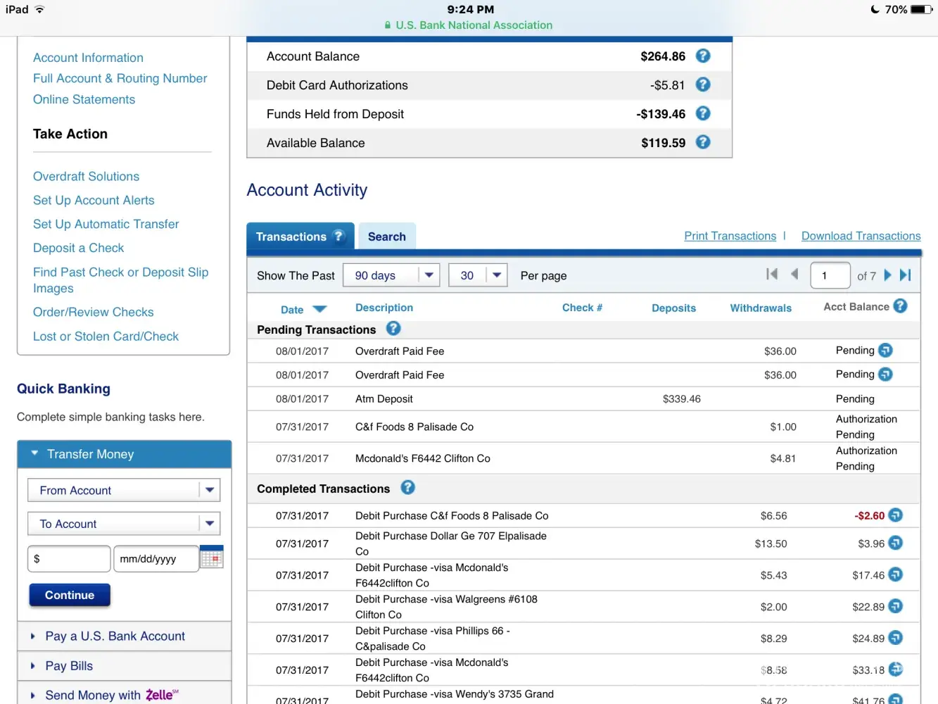 I’m the pictures I posted it shows I have money in my account, and no pending transactions that will affect my balance in a major way, I continued to spend money on necessities and ended up overdrawn by 400+ on my account plus the overdraft fees for each transaction. Illegal!