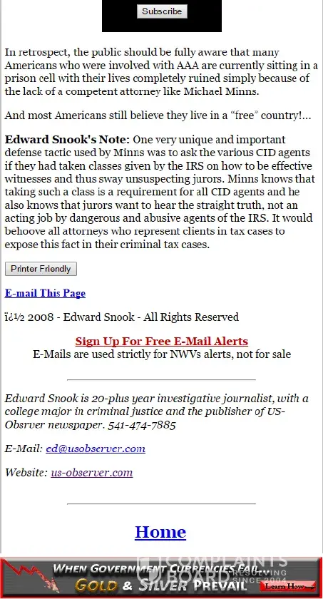 The fact remains that the US Observer, Ed Snook has NOT done what he was hired to do for Chalres Dyer. Snook has published one pathetic article that is a repeat of what had already been proven about Charles Dyer's innocence. Snook's facts in the one article are not even correct. Charles Dyer is not pleased with the one article that was published over a year after Snook was hired by Swan. Snook was hired to go to the District Attorney office, the Sheriff, the Judge and the FBI and expose them for the unlawful conviction and threaten to use the evidence that has been collected by Swan, Charles and others which prove Charles Dyer was set up by the government. All Ed Snook has done is claim he had some undercover covert investigation with the ex wife of Charles and the child of Charles Dyer. Snook claims that this is the only way to get Charles freed from his false conviction, yet Snook advertises that when you have evidence of innocence then he takes the evidence directly to the District attorney and force the DA to drop the charges. This was NEVER done for Charles. Snook has never spoken to the DA in Dyer's case. Nor has Snook performed an investigation into the public officials who were responsible for the conviction. Snook has done nothing except use myself as his scape goat and blame his reason for not getting Dyer out of his false conviction on me, after collecting $19, 500.00 total and waited over a year before he published his pathetic one article for Charles Dyer, yet has published a total of 7 false defamatory articles about myself to destroy my life. Snook was not hired to investigate the ex wife. Snook was hired to expose the corruption and the FBI involvement. Snook has not one time even mentioned the FBI involved in this case and has meetings with the same FBI agents who have been part of the 30 year conviction against Dyer, to try to find a way to have me arrested becuase I recorded my phone calls with the FBI. Snook commits fraud by his false advertisements, denying he had a contract with me after he was hired. Snook has exposed himself by his own words and actions which once are pointed out, cannot be denied that Snook is a fraud. This law suit is Snook’s retaliation agaisnt me. Snook has removed his first article he published about me becuase Snook has changed his stories about me too many times he had to take it down. This shows guilt by Snook because if his article he published was true he would not have taken it down. Snook has since then changed his stories and is trying to now profile me the same way the main stream media does and create FAKE NEWS about me, while false labeling me an “anti government lunatic" and a “right winger”. All of Snook’s claims are fabricated and false. Anyone who reads his law suit will agree that none of what he claims is even true. Snook does not think that anyone has a right to complain and share the outrageous abuse he tries to bully people with. Snook is not ethical, fair, or moral with how he operates his dealing with customers who are not pleased with his performance. When asked to prove that Snook has vindicated over 4, 000 false convictions, all Snook does is point you to a page where he has the same people listed with the same cases the past 6 years. Snook should have a link to every case he has done which should have over 4, 000 cases for people to read and research just exactly what did Snook do in order to get the case dropped… Snook is abusive, unfair, immoral, manipulates, threatens, and uses his paper against anyone who complains about the US Observer, and Snook threatens a lawsuit. Snook has lied about the consumer complaints filed by Swan and has lied about the BBB complaints. This will be addressed in the counter claims Swan has filed once the appeal courts rule on Snooks appeal. Snook has continued with his defamation while this case has been in abeyance. Snook’s appeal he filed against me is for an order that the judge ruled in my favor. I have managed to stay in this case and represent myself for almost 3 1/2 years against Snook. James Leuenberger is the opposing attorney who has been practicing 28 years as a criminal defense lawyer. Leuenberger I am sure regrets getting himself into this mess for Snook. Leuenberger and Snook both under estimated me.