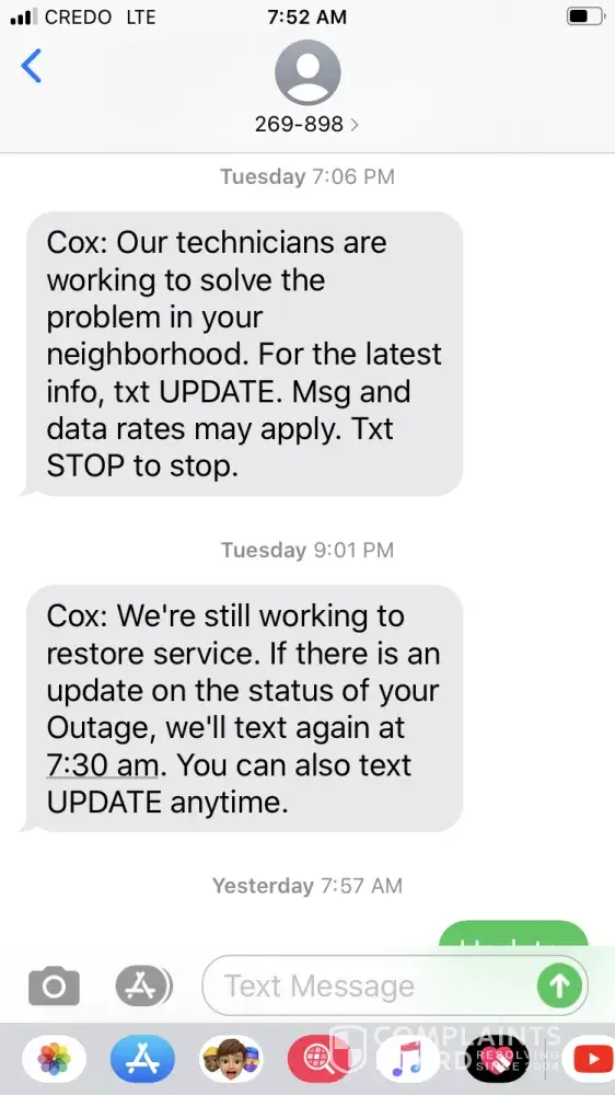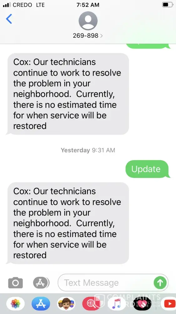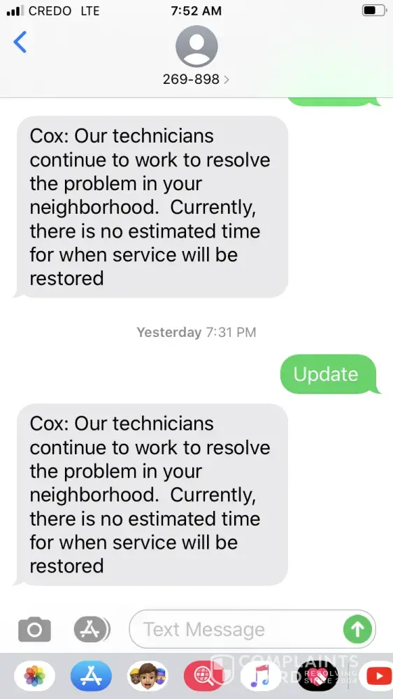 I open an account 2 days ago and my internet was fine. I left home and by the time I got to my daughters house to use her pc to Change my password, my internet was offline and has been every since. I have been getting updates saying technicians are working on fixing the problem in my community, yet I can see my neighbors who have internet and are connected in my phone. This don't make sense when your company has been around long enough to be specific if there is a problem that's effecting your customers this long. Tomorrow will be 3 days. I have a grand daughter who need to do schoolwork and she can't do her homework at all. Unacceptable. I have more screenshots in my photos of the same thing. Cox has been around too long. This makes no sense.