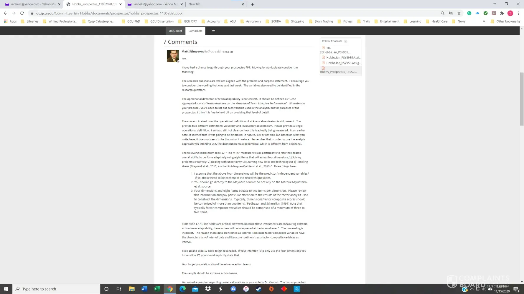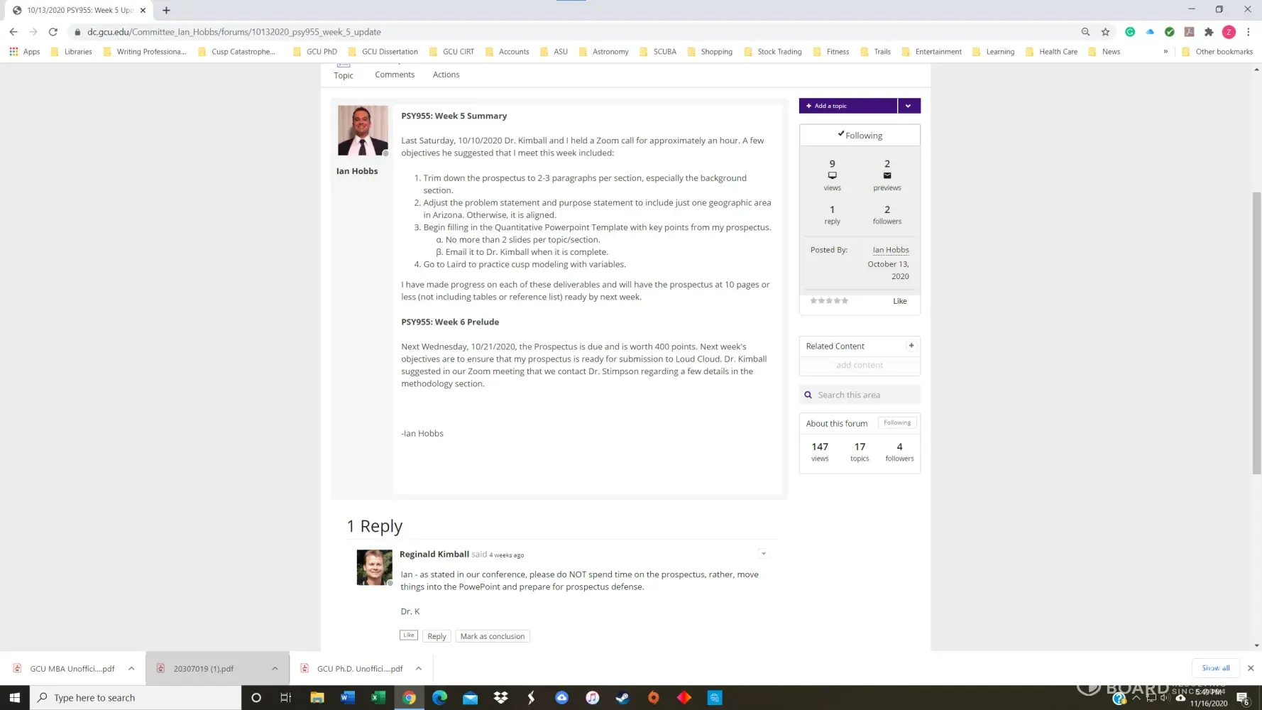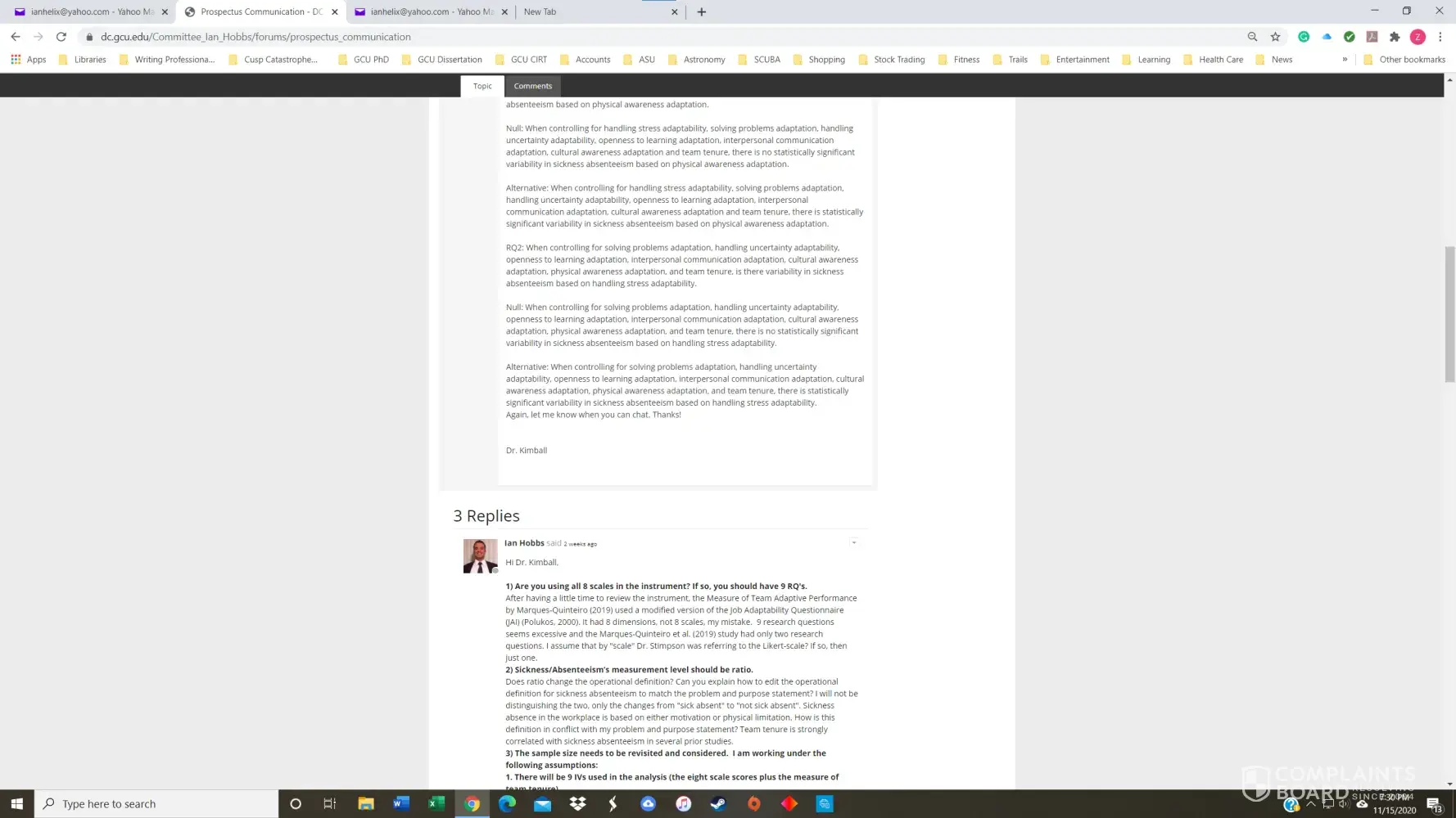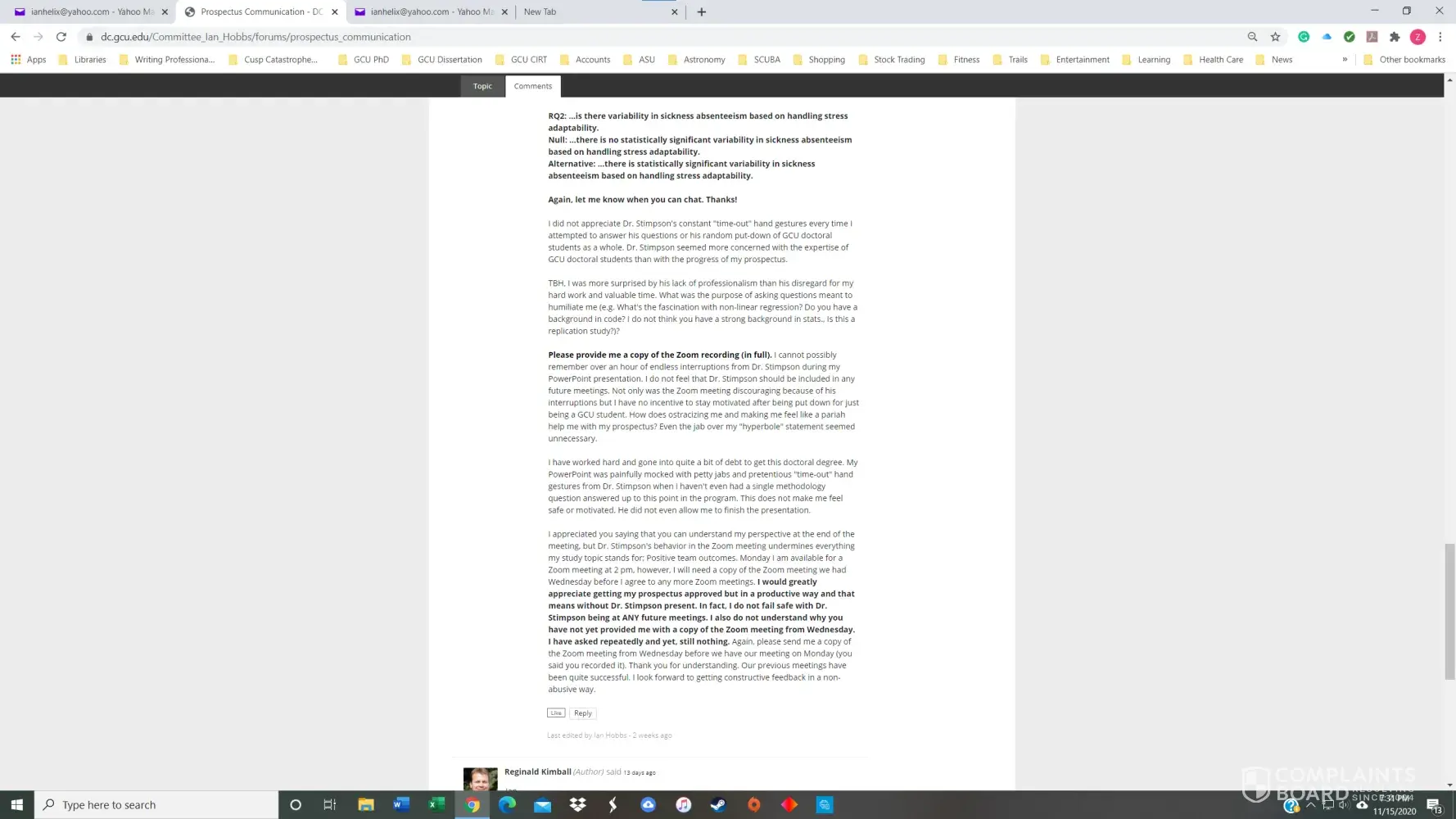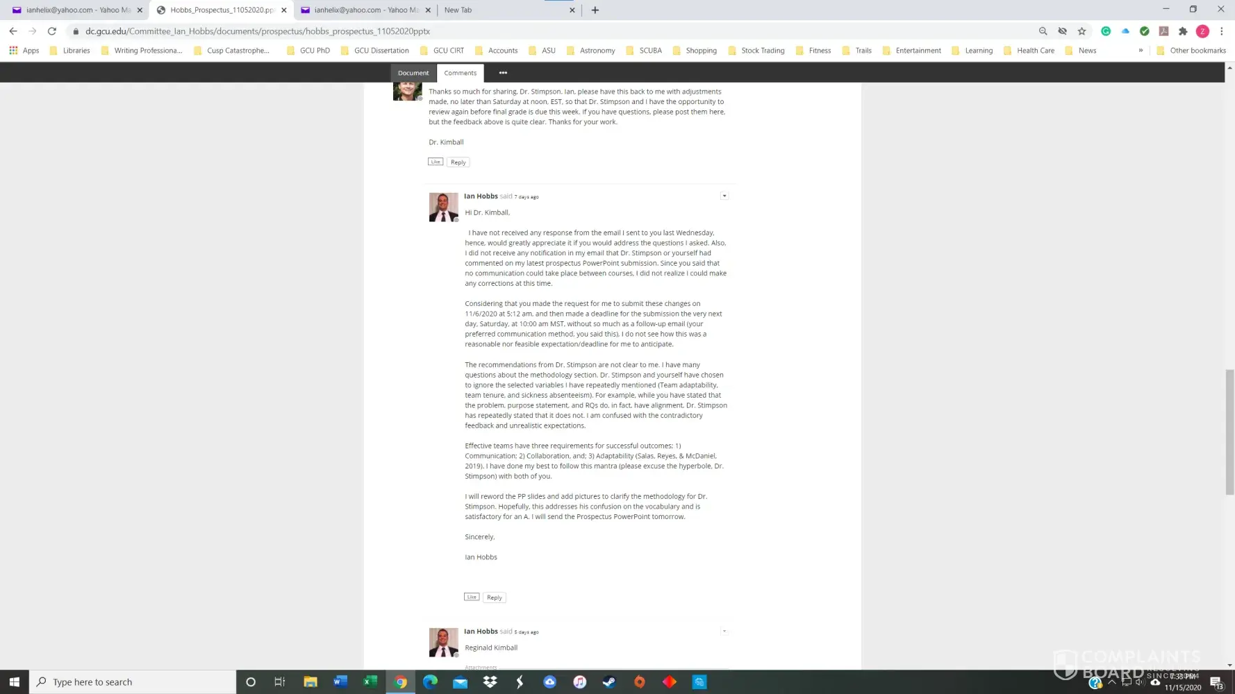 I had a 3.8 GPA in the GCU Doctoral Psychology program until November of 2020. I received my first chair, Dr. Maxson, for PSY855 Developing the Research Proposal, in early July. Dr. Maxson missed our first Zoom meeting because he was on vacation in Palm Springs, California, regardless that we had agreed to the meeting date/time only three days prior. He also stated on several occasions that he was not qualified to advise me on my dissertation topic and stonewalled many of my attempts to get substantive feedback. After making a complaint, he finally approved my prospectus but was replaced with Dr. Kimball and a new methodologist in week 4 of the next course, PSY955 Dissertation I.