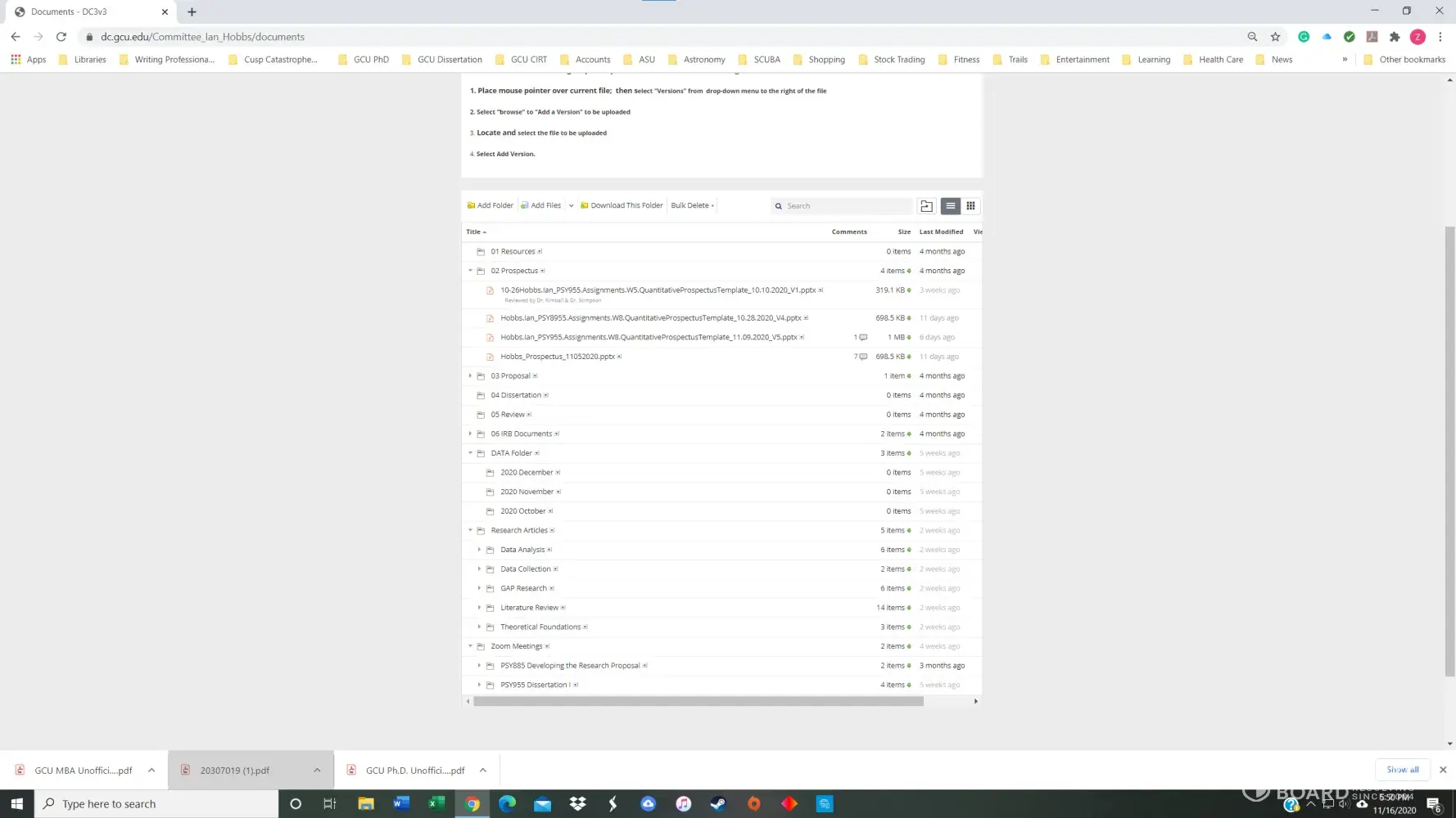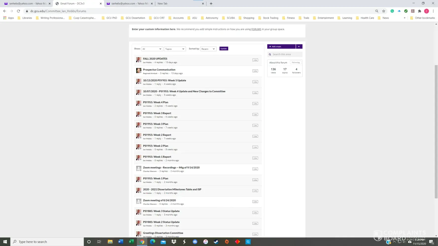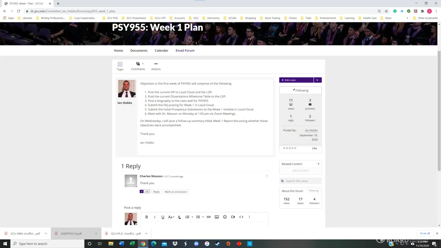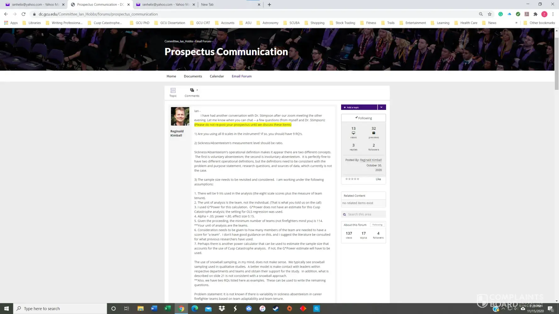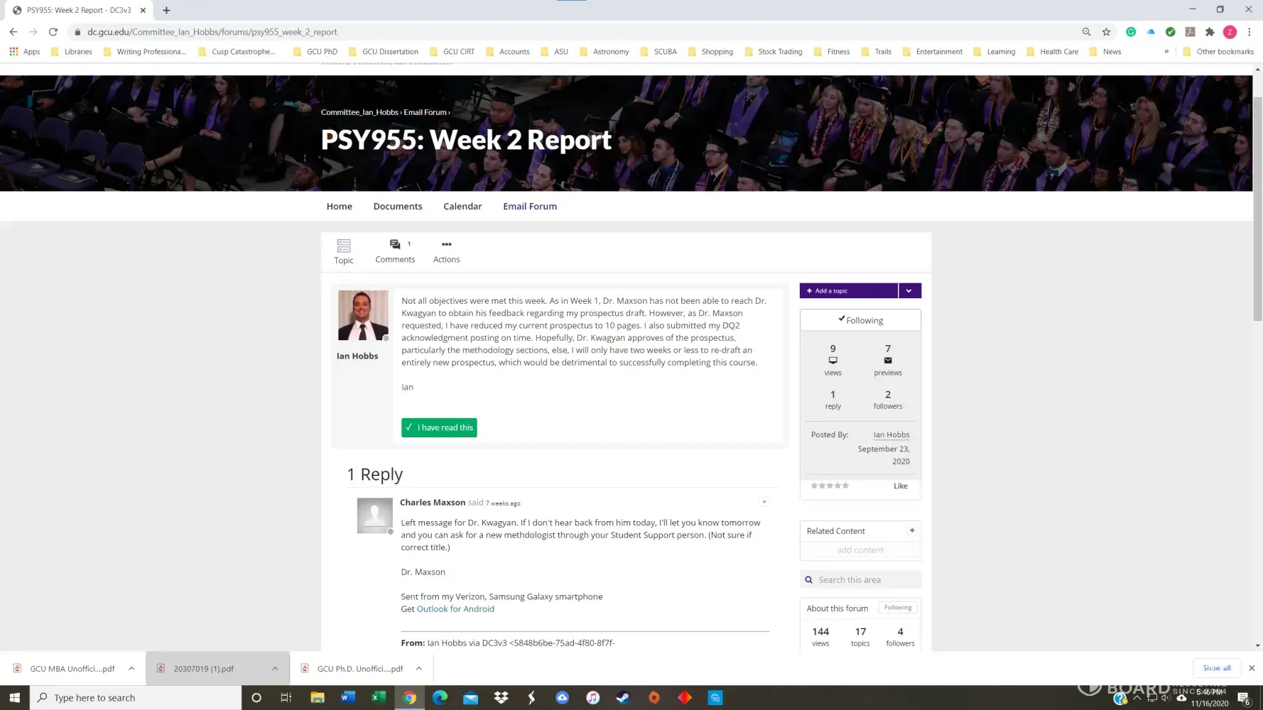 I had a 3.8 GPA in the GCU Doctoral Psychology program until November of 2020. I received my first chair, Dr. Maxson, for PSY855 Developing the Research Proposal, in early July. Dr. Maxson missed our first Zoom meeting because he was on vacation in Palm Springs, California, regardless that we had agreed to the meeting date/time only three days prior. He also stated on several occasions that he was not qualified to advise me on my dissertation topic and stonewalled many of my attempts to get substantive feedback. After making a complaint, he finally approved my prospectus but was replaced with Dr. Kimball and a new methodologist in week 4 of the next course, PSY955 Dissertation I.