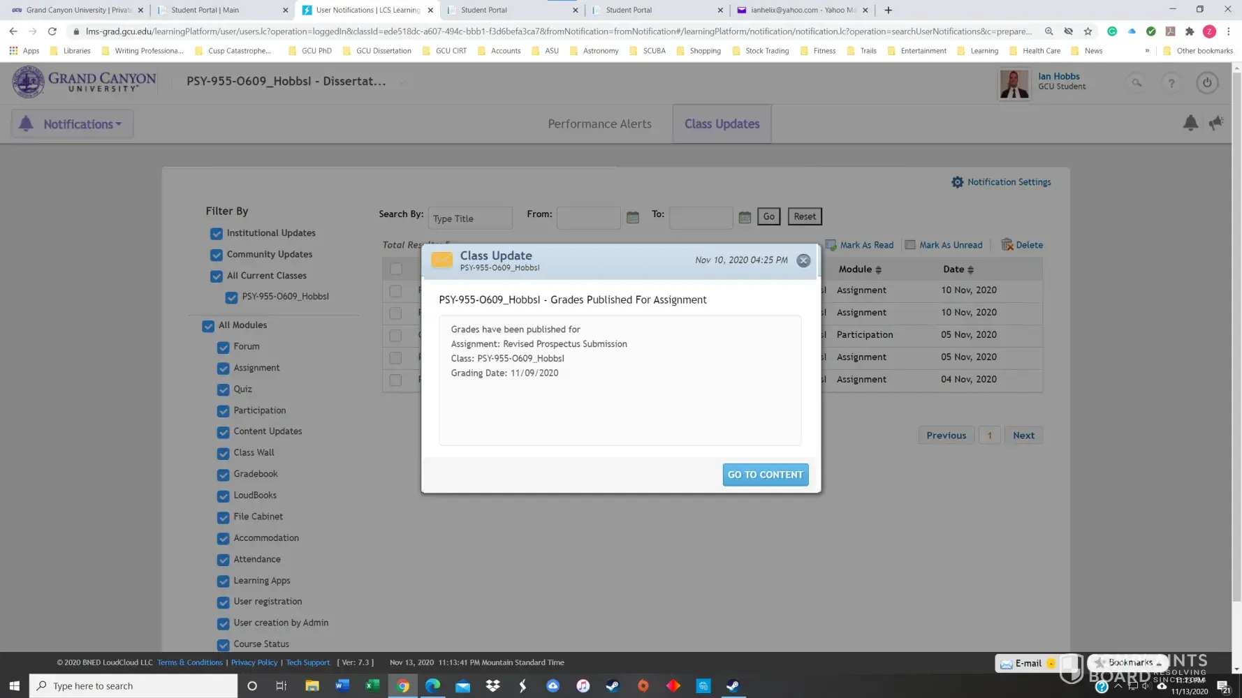 On Sunday evening, 11/8/2020, at 4:07 pm, Dr. Kimball finally informed me via email of the latest feedback that Dr. Stimpson and Dr. Kimball had provided in the LDP on Friday night 11/6/2020. I did my best and as quickly as possible to apply the requested revisions and submitted it in the LDP in response to Dr. Kimball in the LDP on Tuesday night 11/10/2020, because Loud Cloud would not allow me to submit anything after 11/2/2020. Nevertheless, Dr. Kimball graded it as a 0/400, the very next day, posting it several times in Loud Cloud in a row stating only, "This was posted 5 days late...", which it was not. Three days later my mother died on Friday night, 11/13/2020.