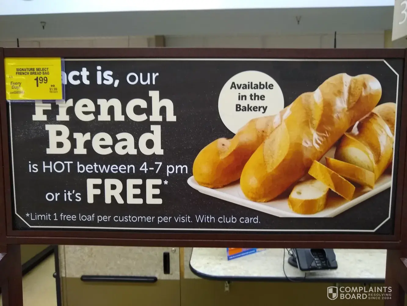 The Vons at my location currently has a promotion for fresh french bread. The promotion states that "Fact is, our french bread is HOT between 4-7 pm, or it's FREE." (See attached image.) This statement is confusing because it could mean that (1) if the bread is not hot between 4-7 pm, it'd be free, or (2) if it's not between 4-7 pm the bread would be free. I thought (2) was reasonable because wouldn't the store want to get rid of all the bread that ended up not being sold the same day it was baked by making it free? If it is instead saved and sold tomorrow then the bread wouldn't fit the promotion description because it would no longer be "fresh".